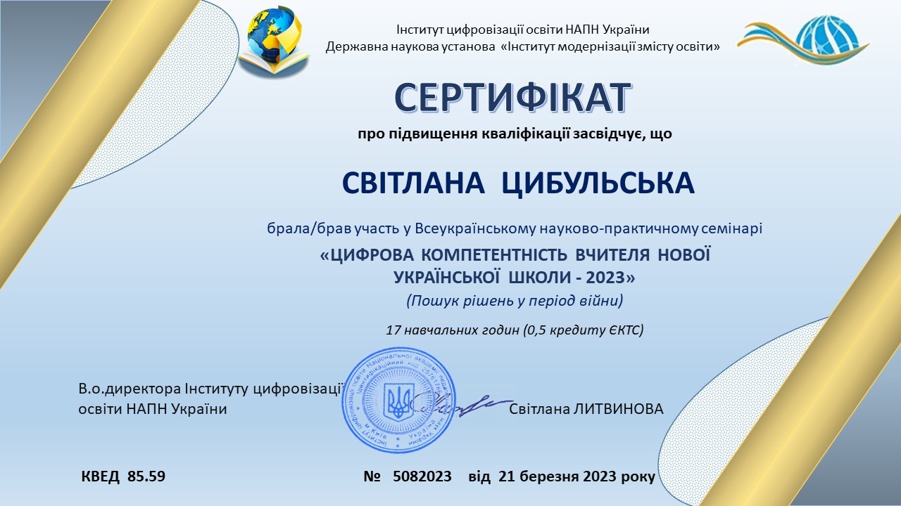 | 7893 | УКРАЇНА НА ШЛЯХУ ВІДНОВЛЕННЯ: ЗАВДАННЯ НАУКИ І ОСВІТИ В ЄВРОПЕЇЗАЦІЇ ДЕРЖАВИ» | Інший модуль | Сертифікат_Цибульська Світлана Михайлівна.pdf | 19.05.2023 00:00 |