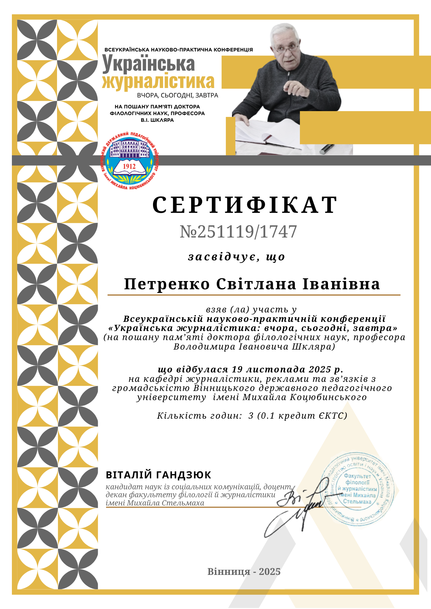 723 Факультет журналістики Кафедра журналістики та нових медіа 27.9 1 2025 https://www.researchgate.net/profile/Svitlana-Petrenko
