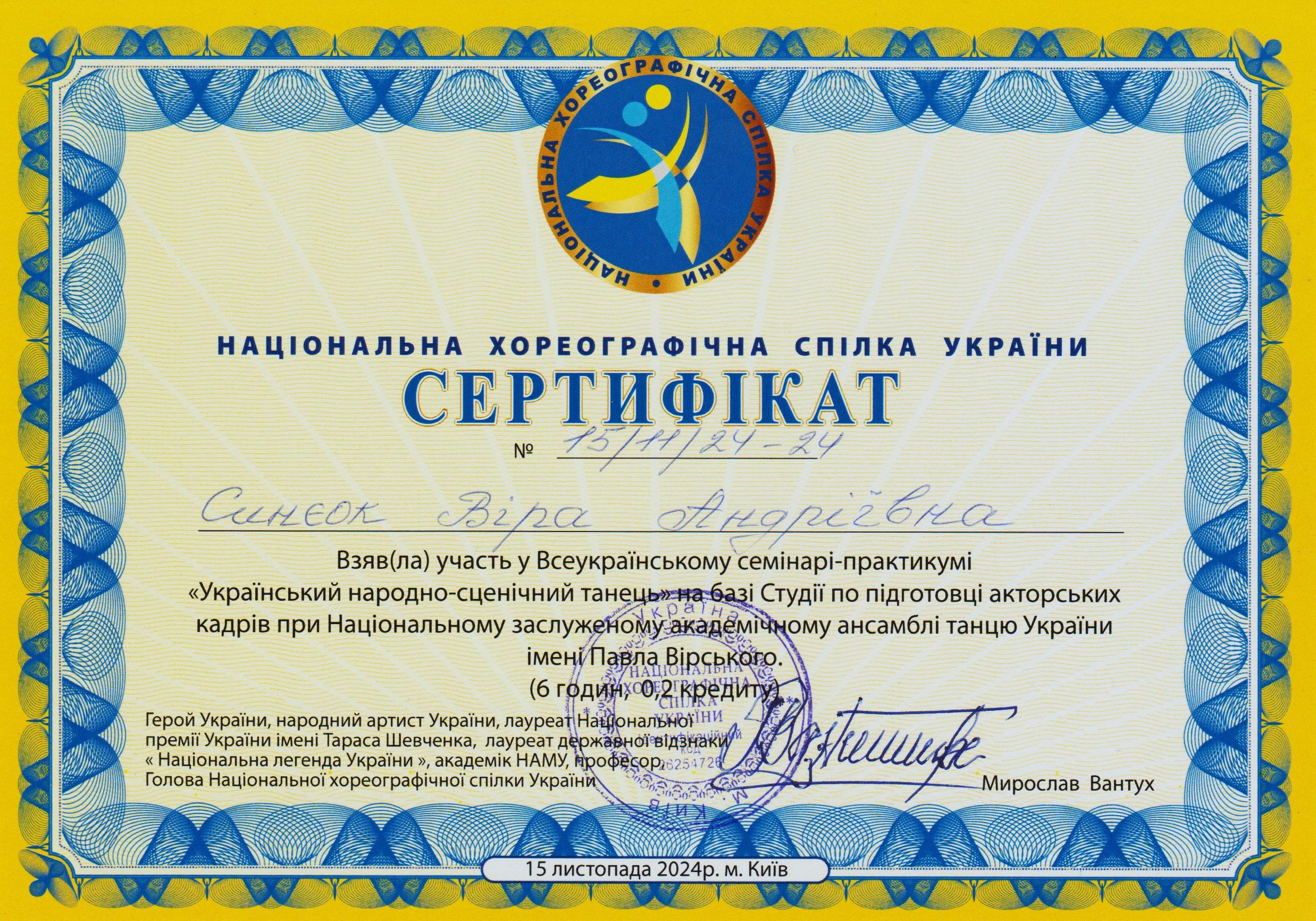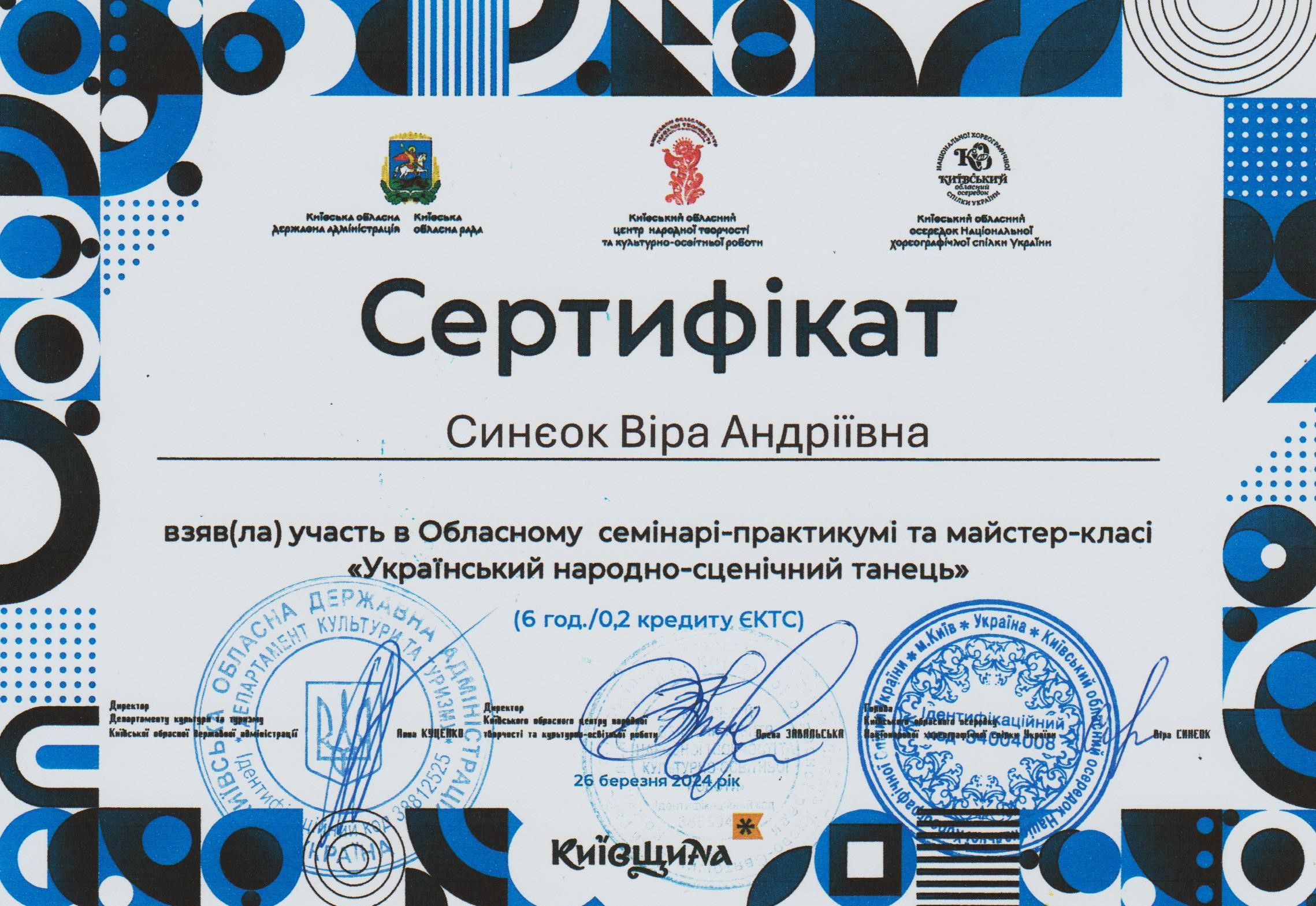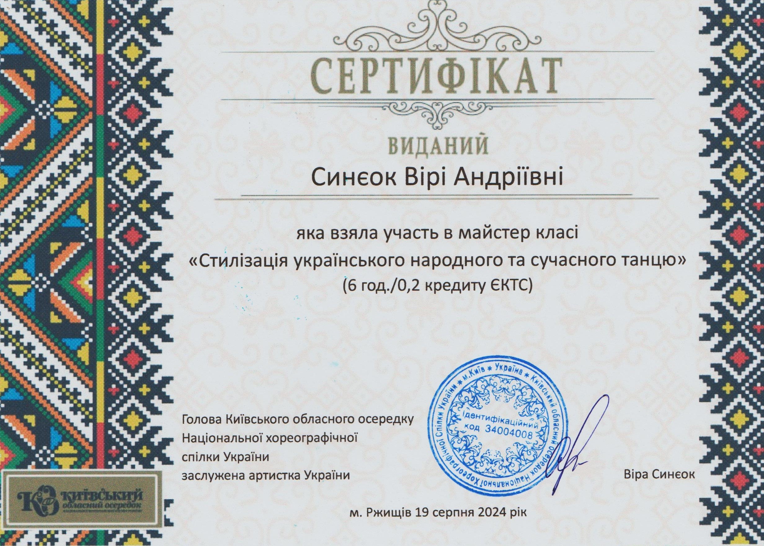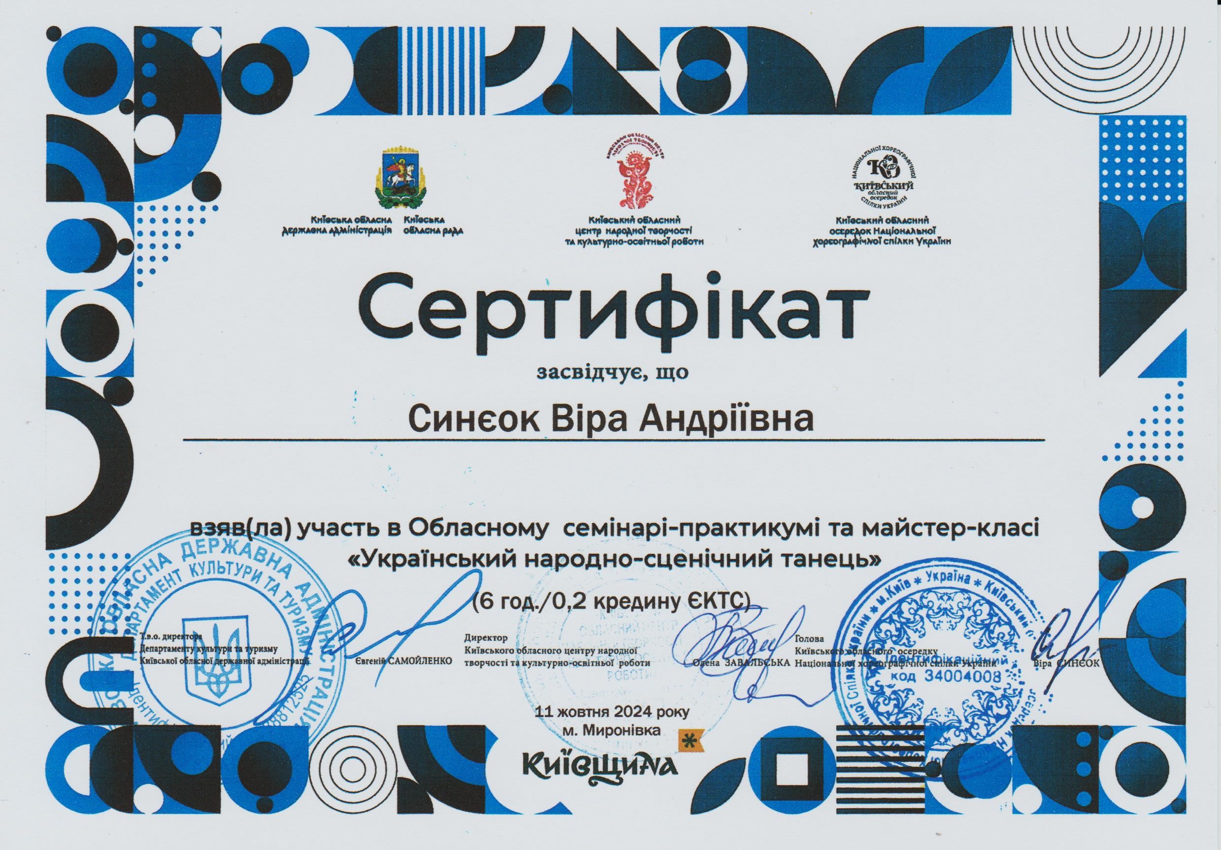 | 10254 | Семінар-практикум та майстер класи «Український народно-сценічний танець» | Система навчання та процес оволодіння мистецтвом українського народного танцю в дитячих аматорських хореографічних колективах Київської області | с. Дмитрівка |