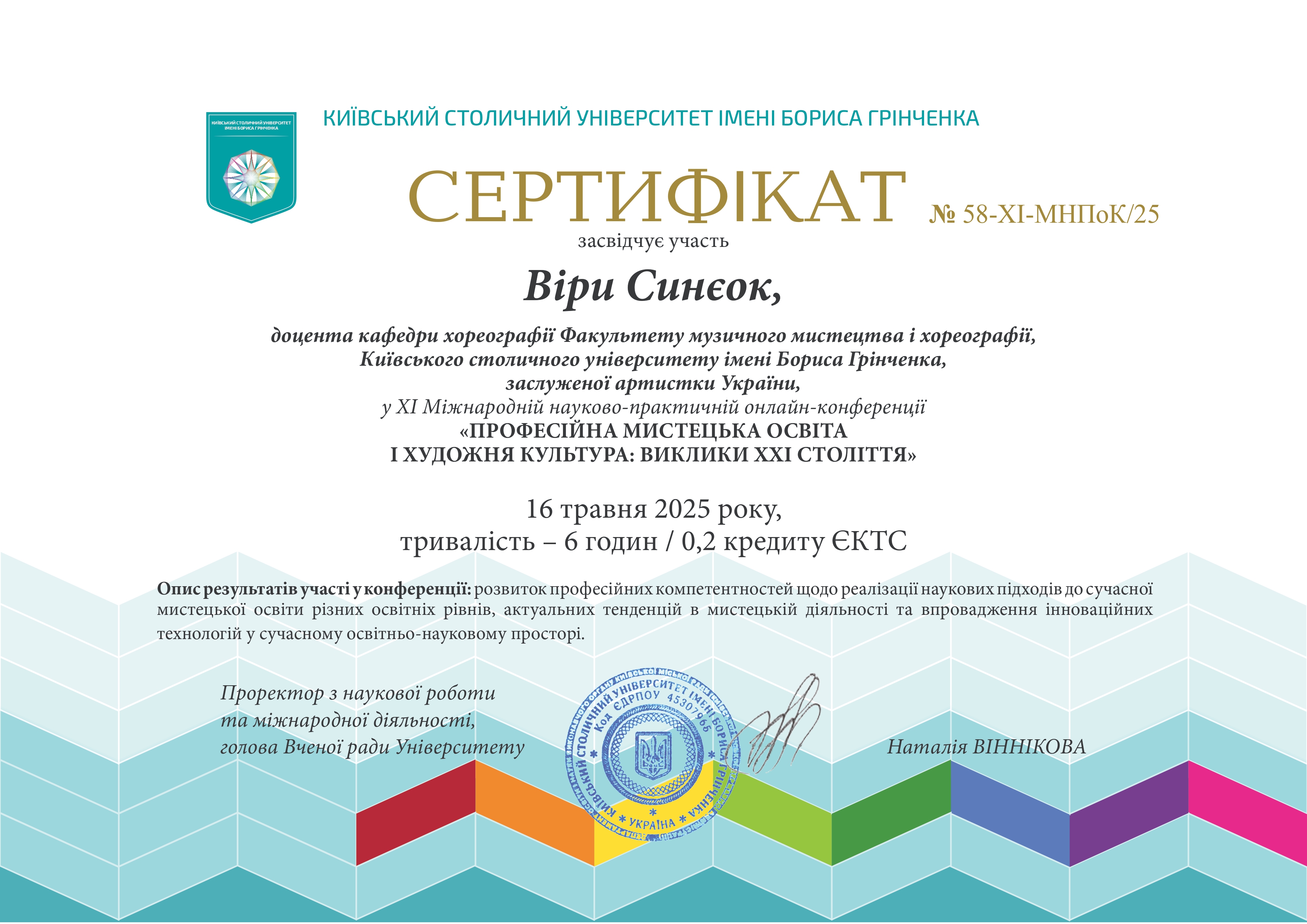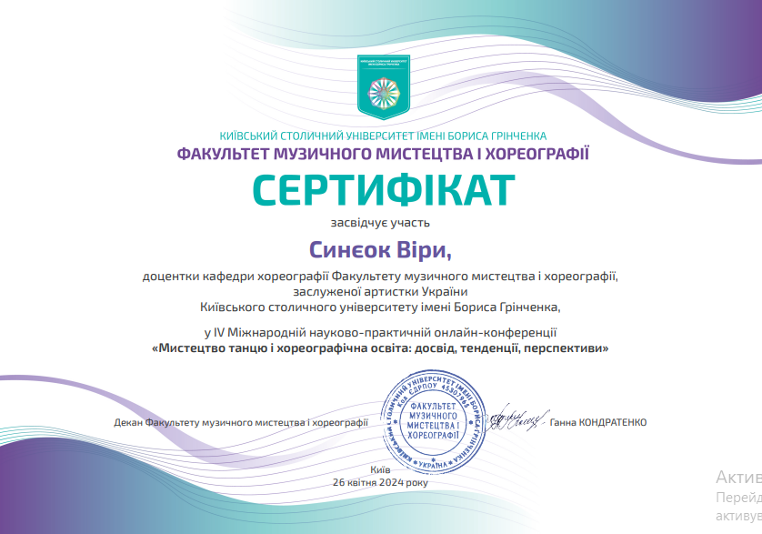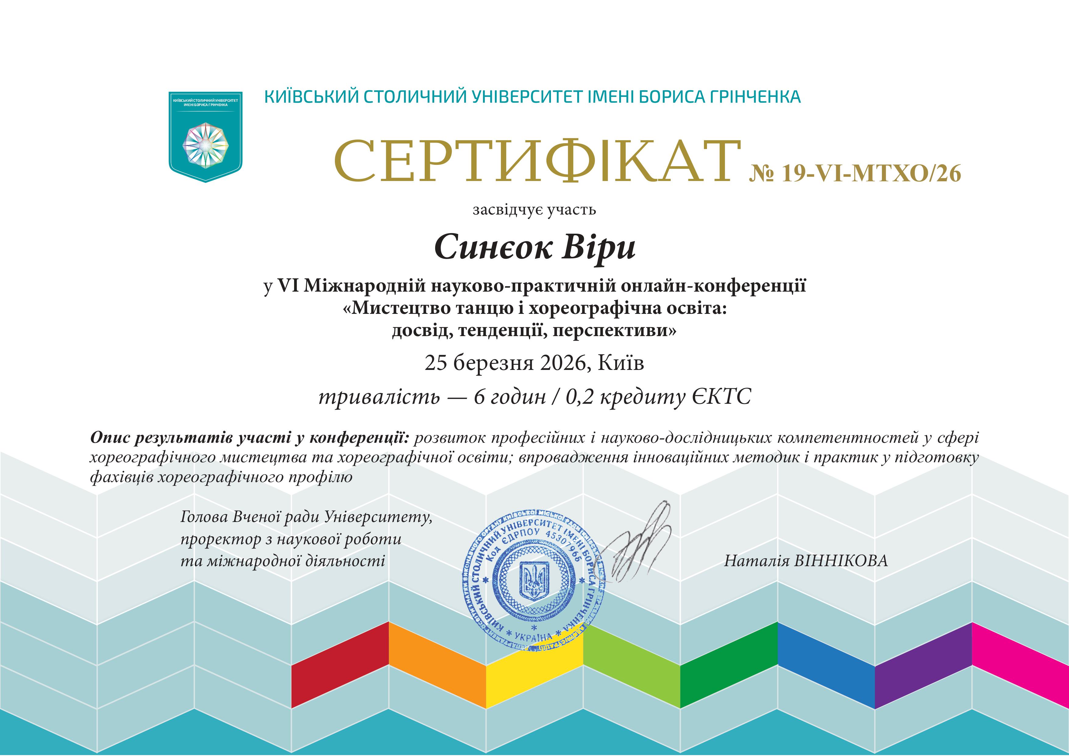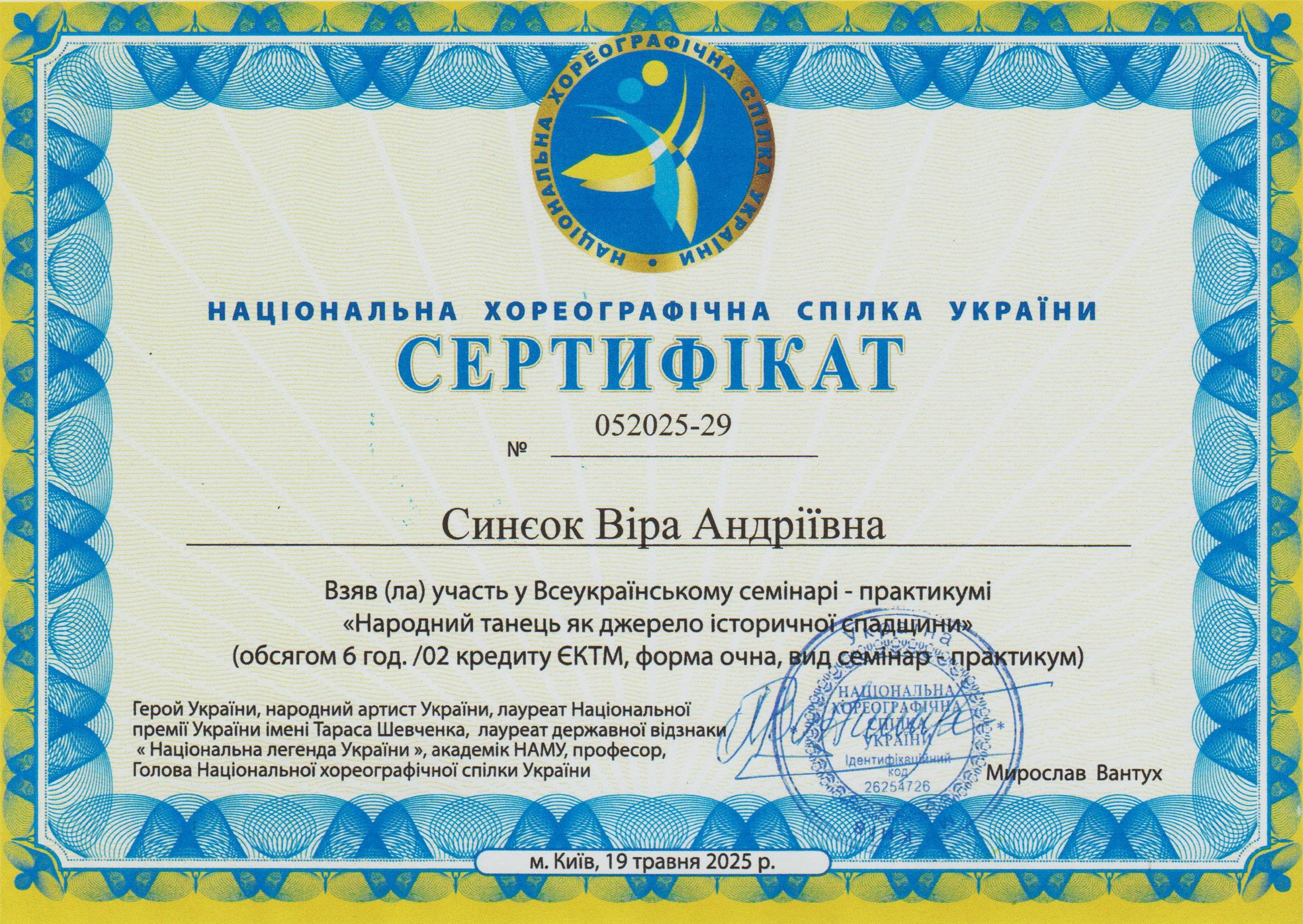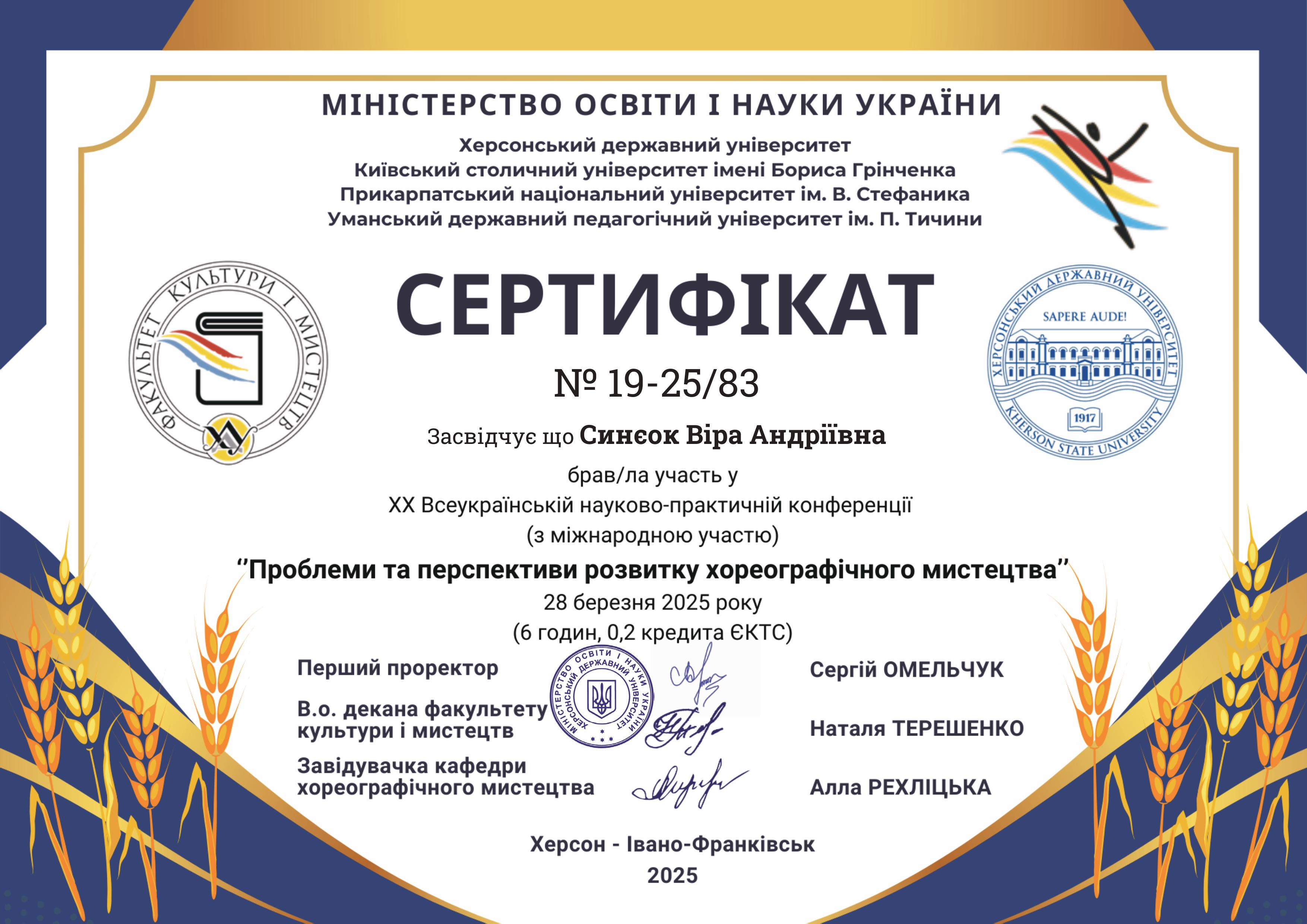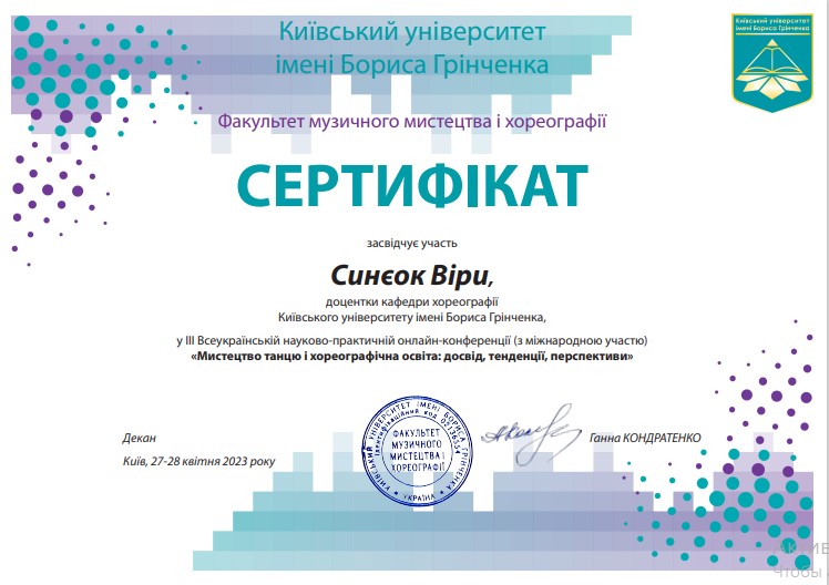 | 652 | Факультет музичного мистецтва і хореографії | Кафедра хореографії | 2 | 1 | 2025 | https://www.researchgate.net/profile/Vira-Synieok |
