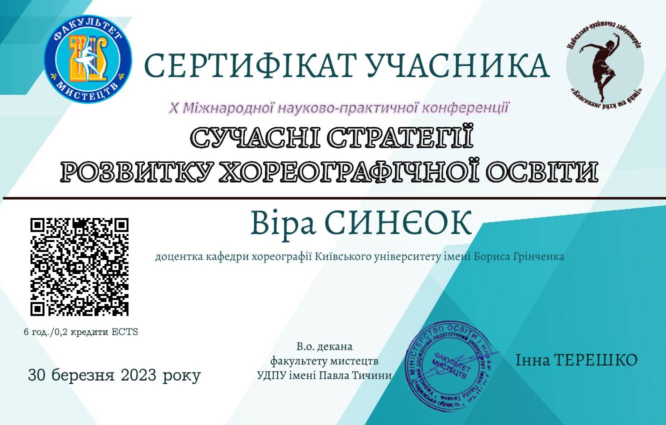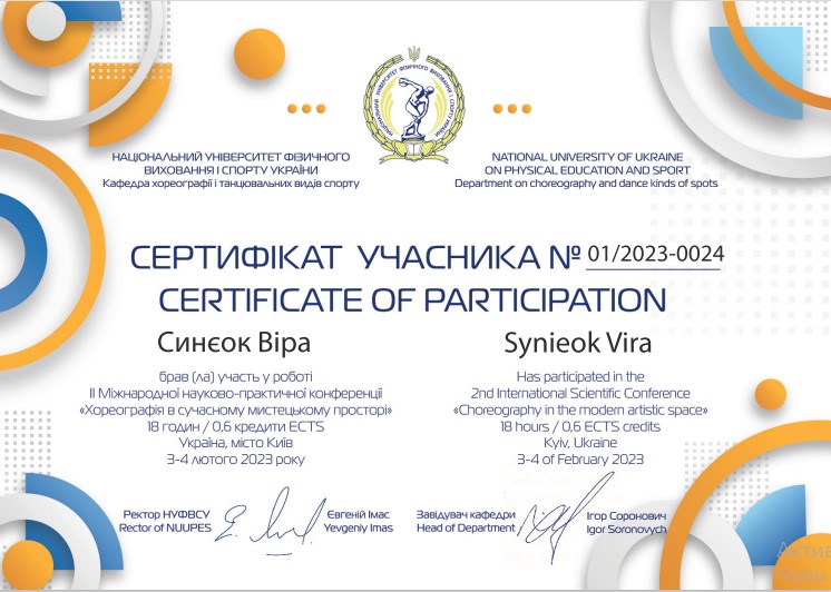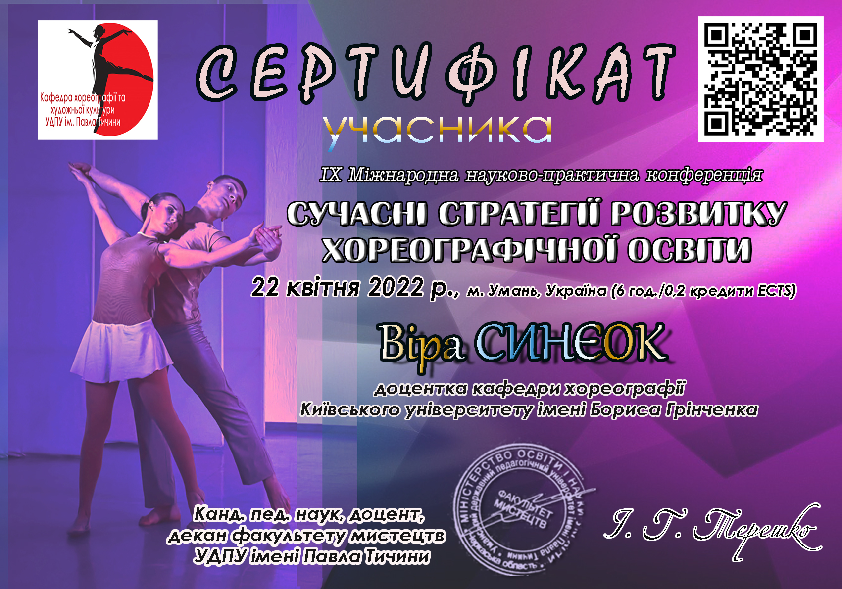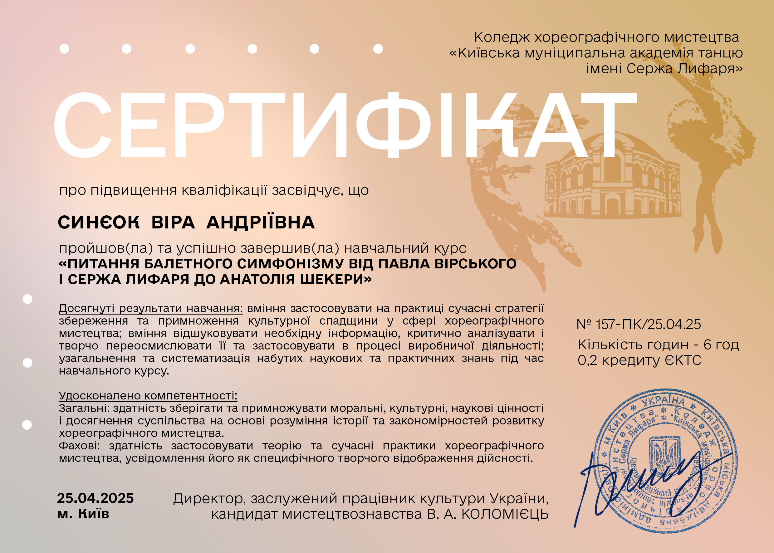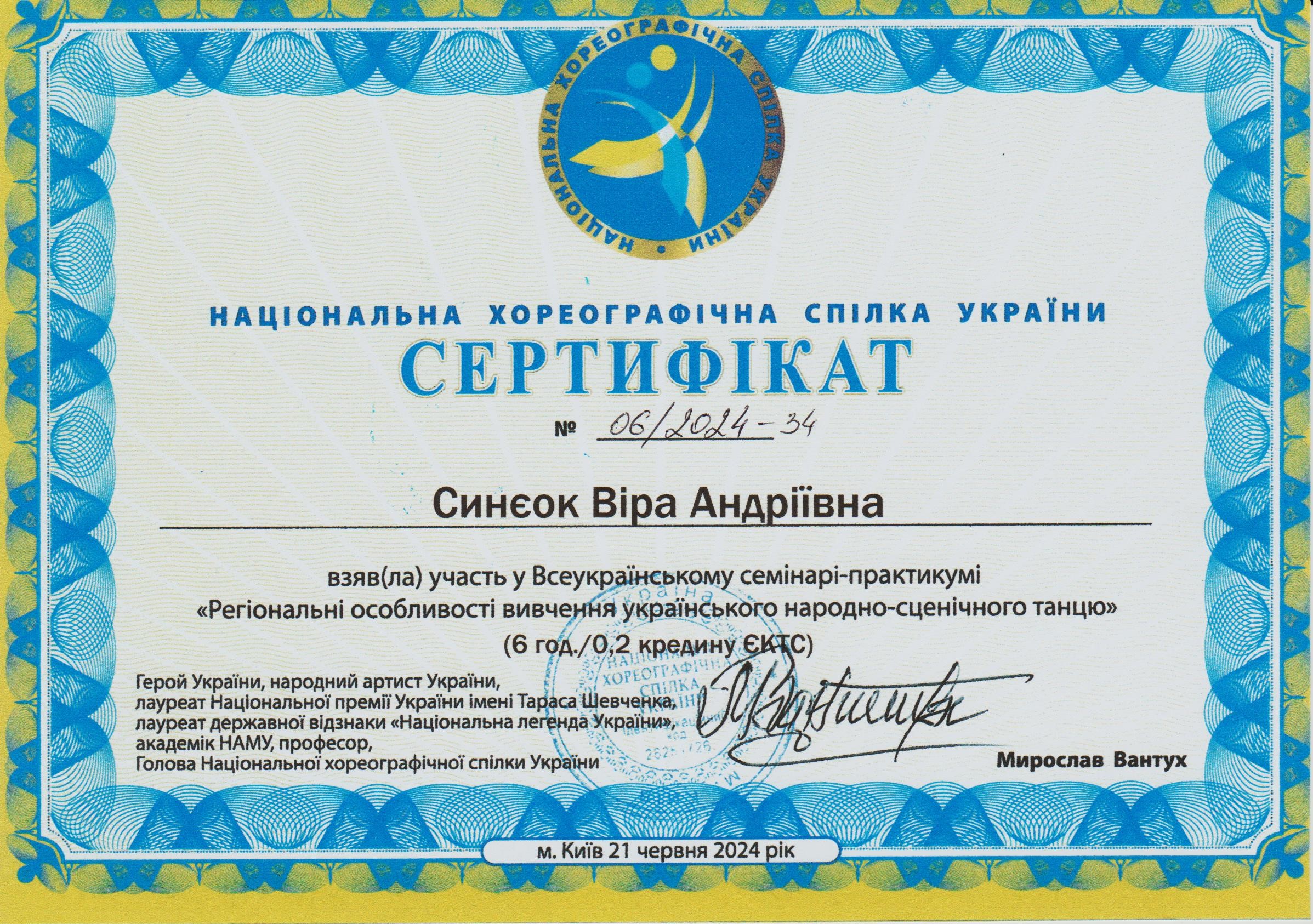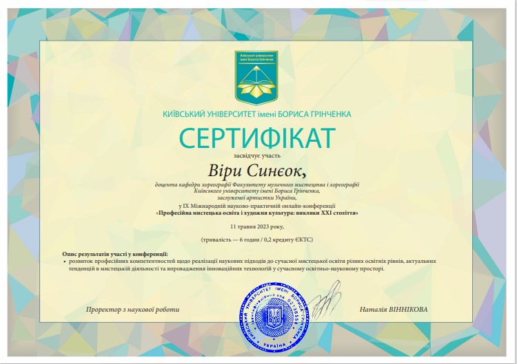| 652 | Факультет музичного мистецтва і хореографії | Кафедра хореографії | 2 | 1 | 2025 | https://www.researchgate.net/profile/Vira-Synieok |