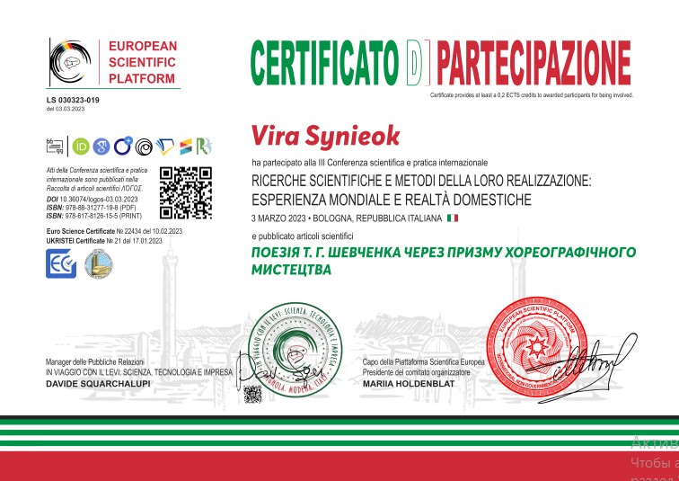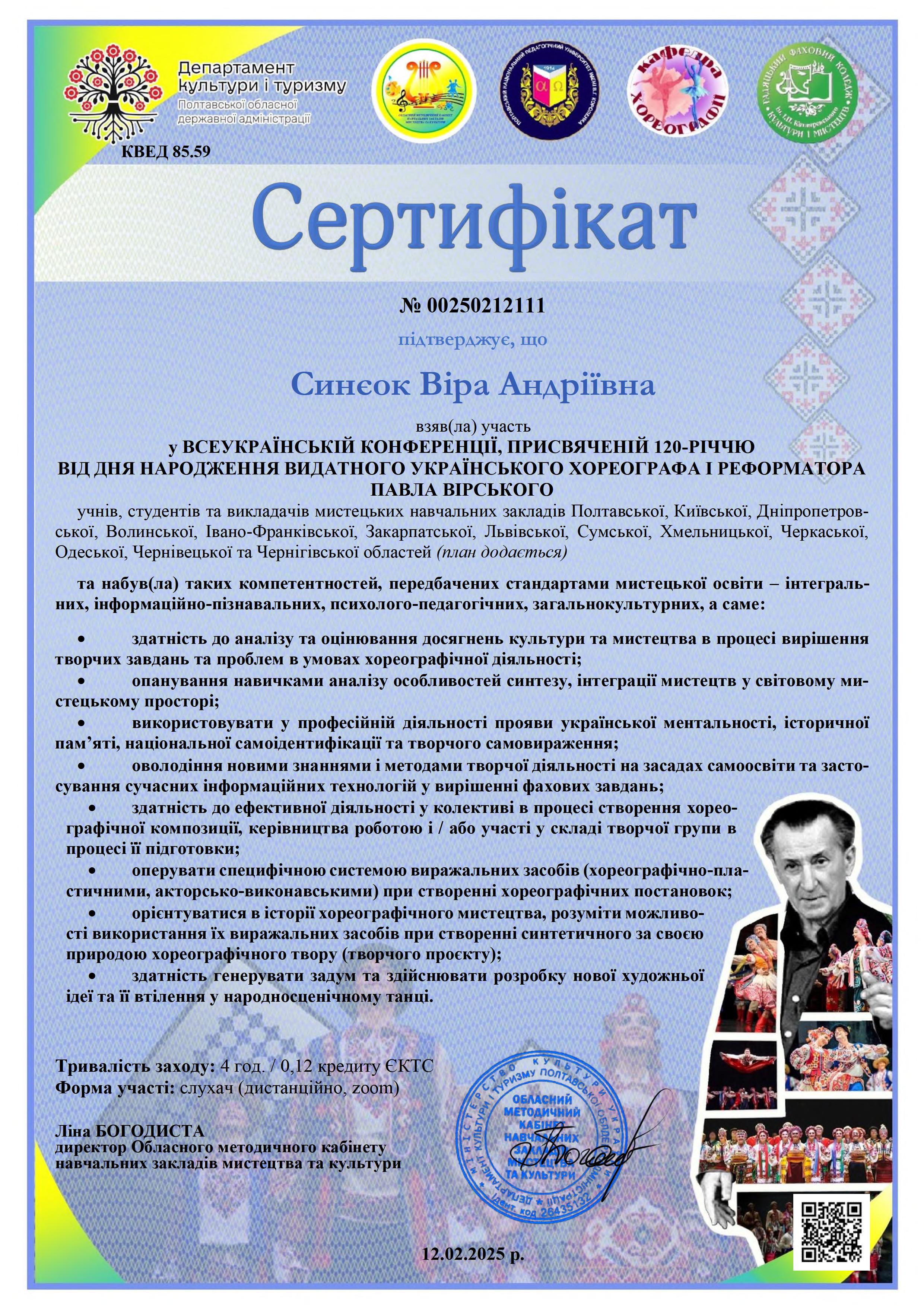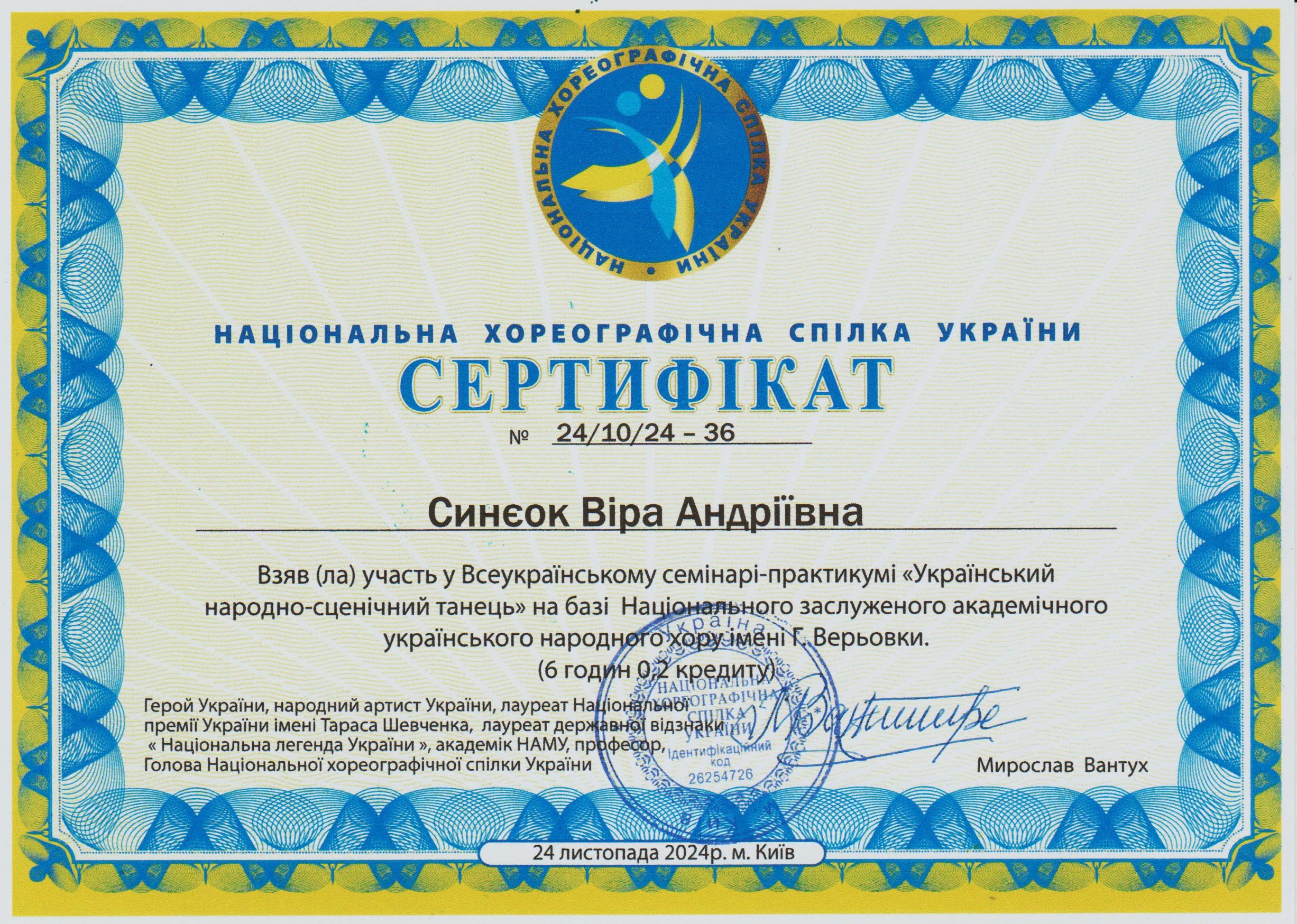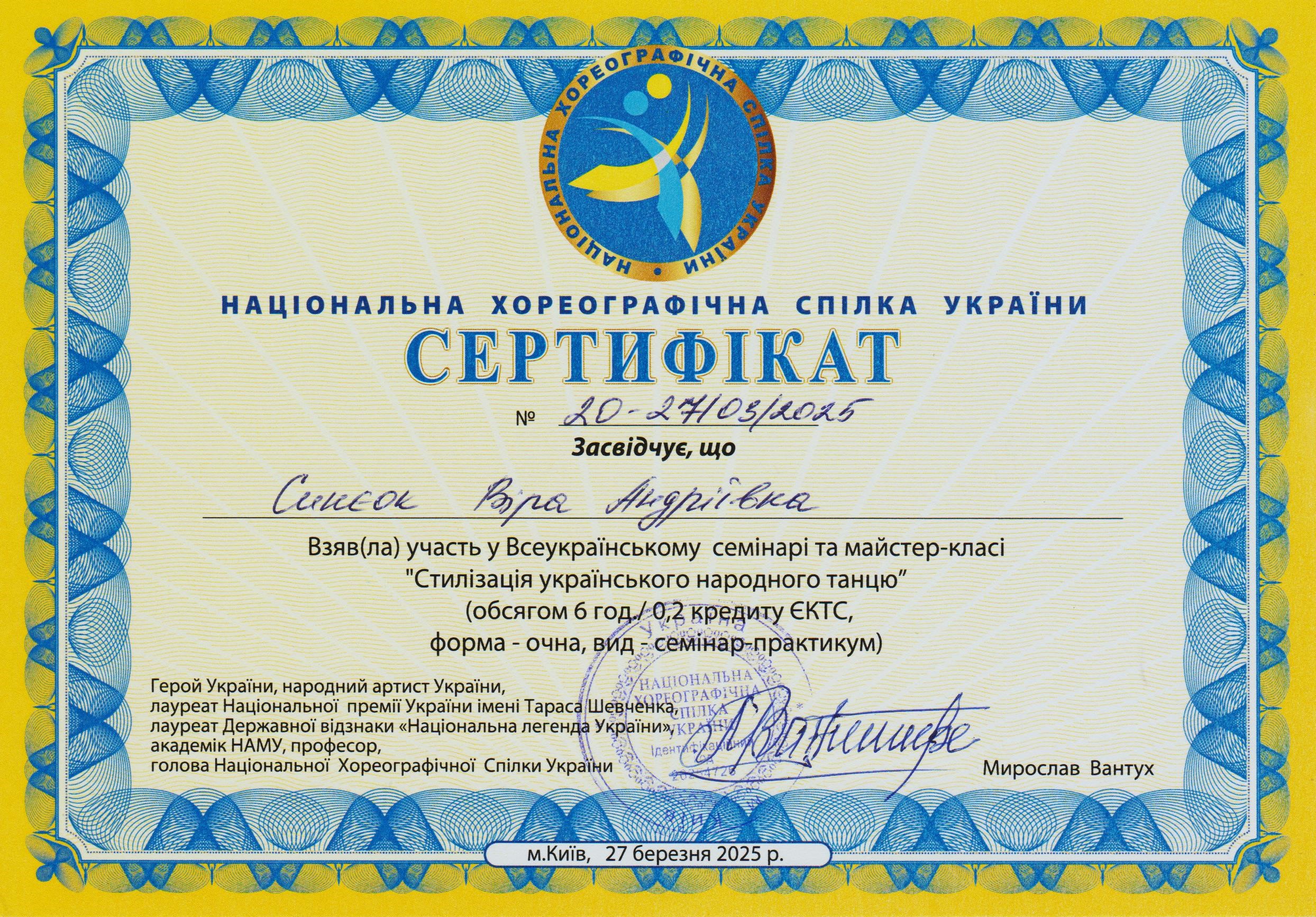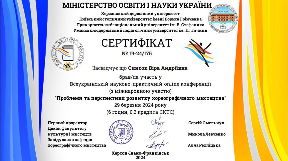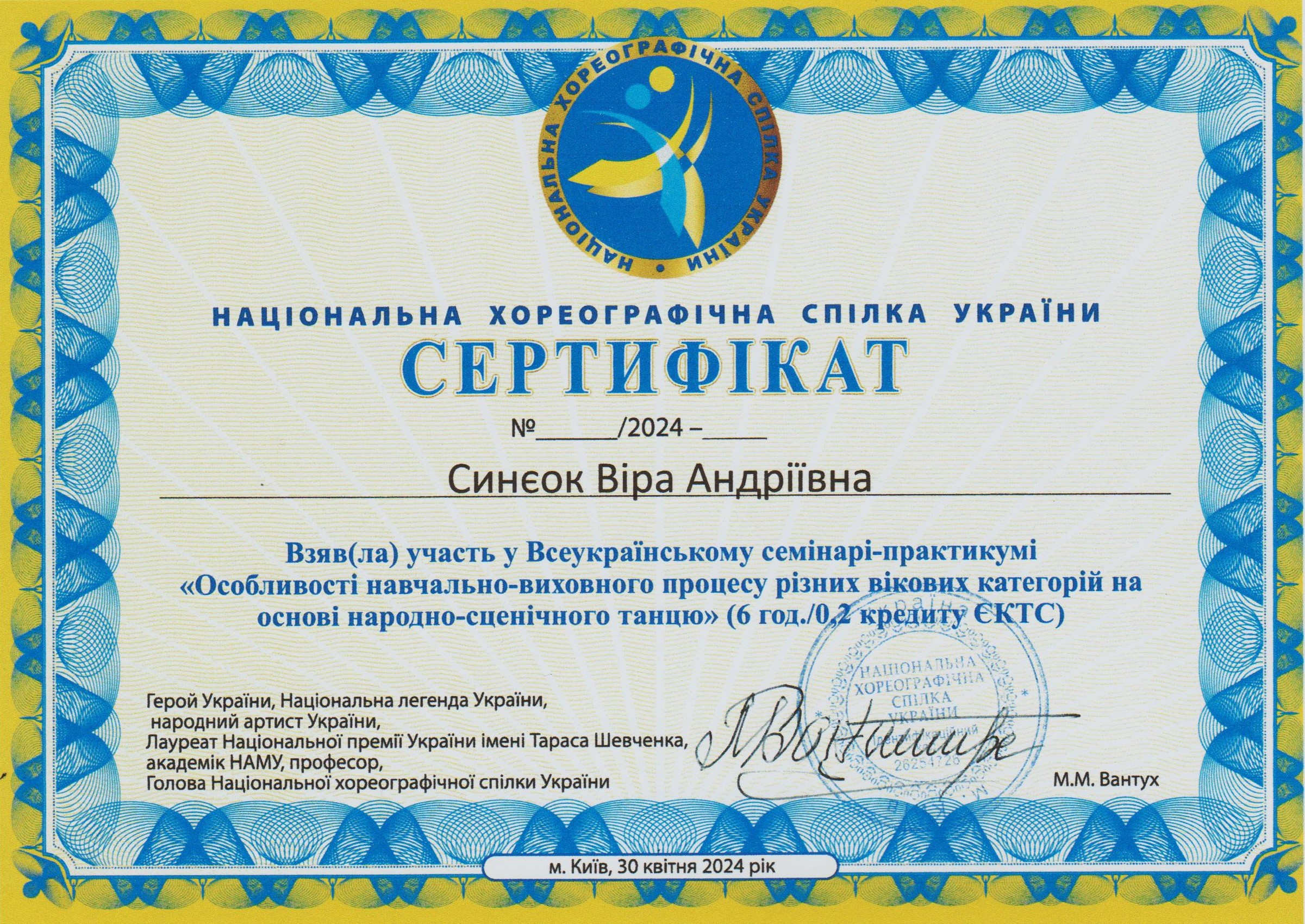 | 652 | Факультет музичного мистецтва і хореографії | Кафедра хореографії | 2 | 1 | 2025 | https://www.researchgate.net/profile/Vira-Synieok |