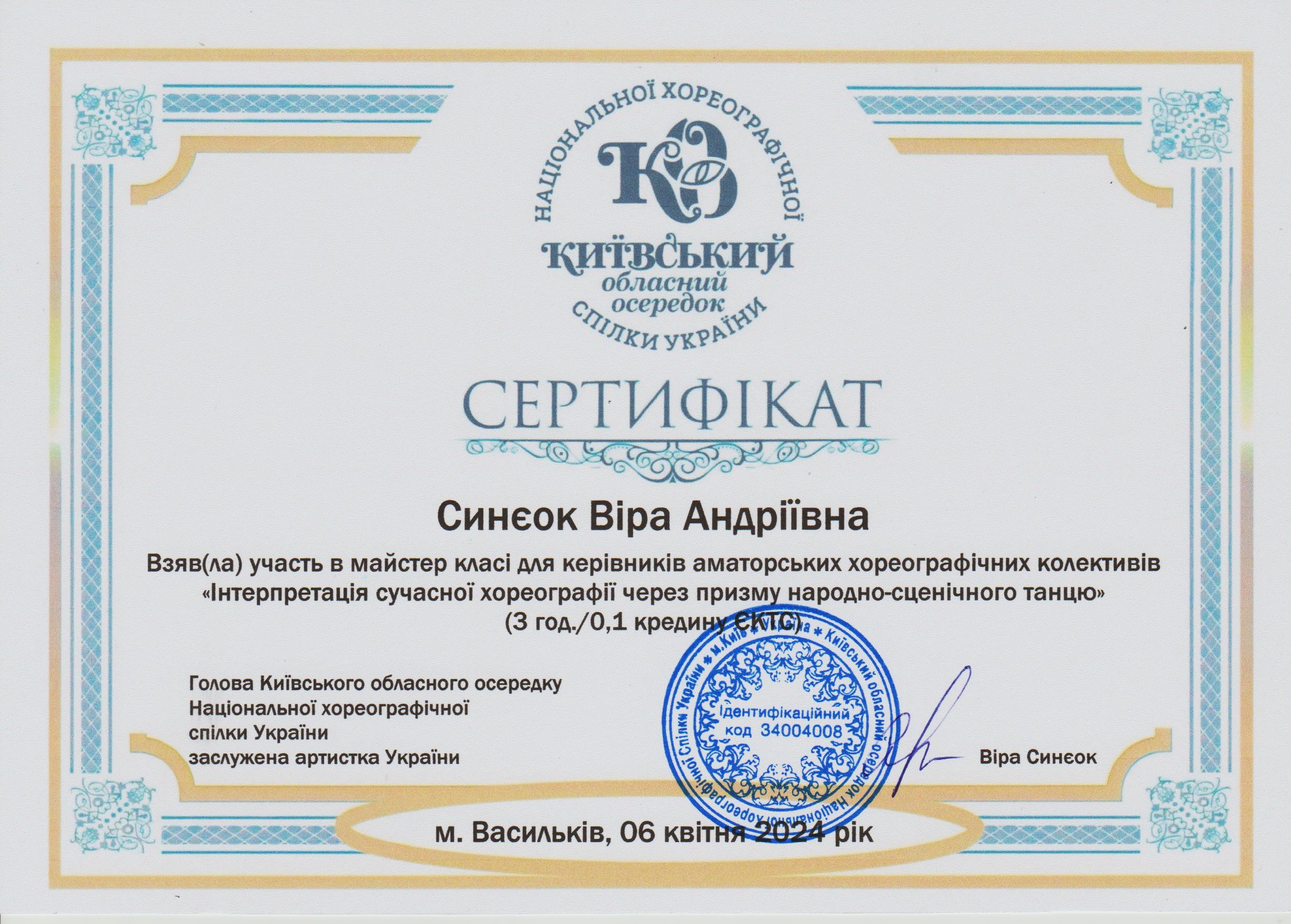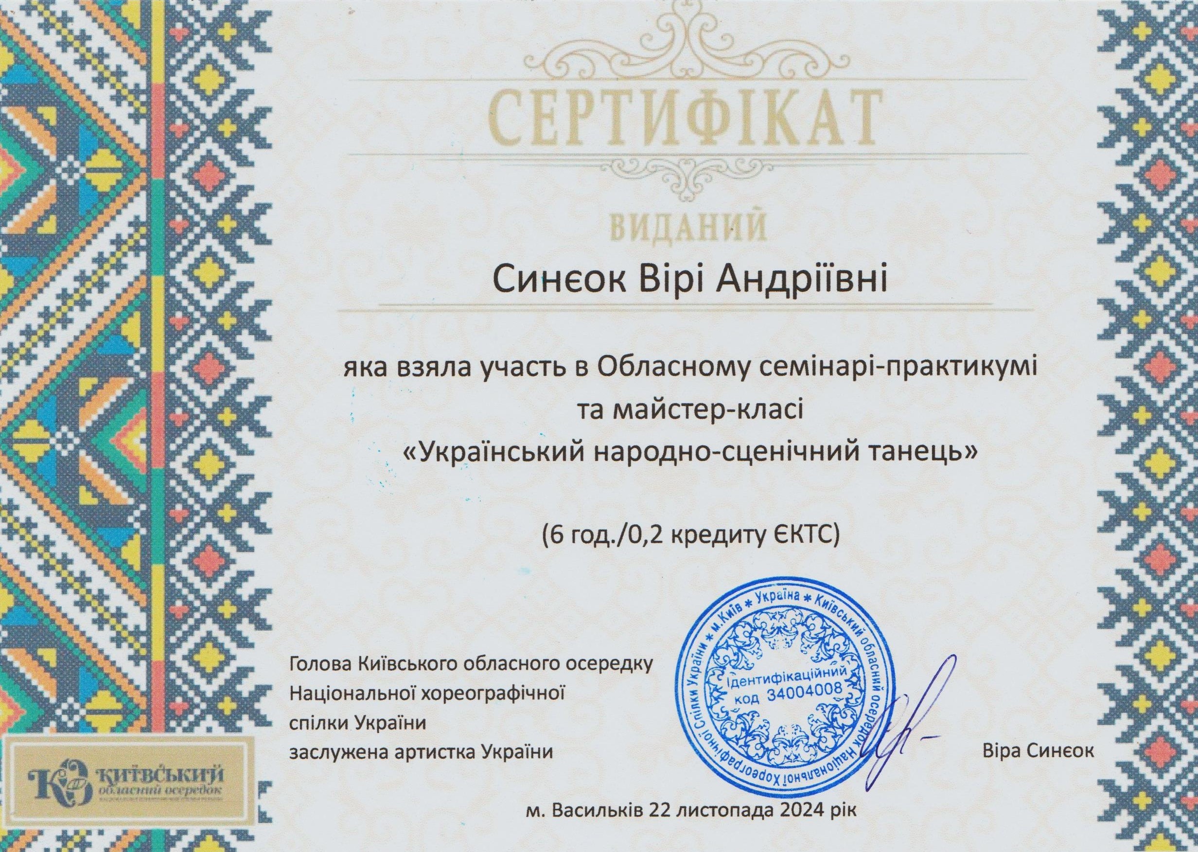 | 11054 | Обласний семінар-практикум та майстер-клас "Український народно-сценічний танець" | Система навчання та процес оволодіння мистецтвом українського народного танцю в дитячих аматорських хореографічних колективах Київської області | Васильків |