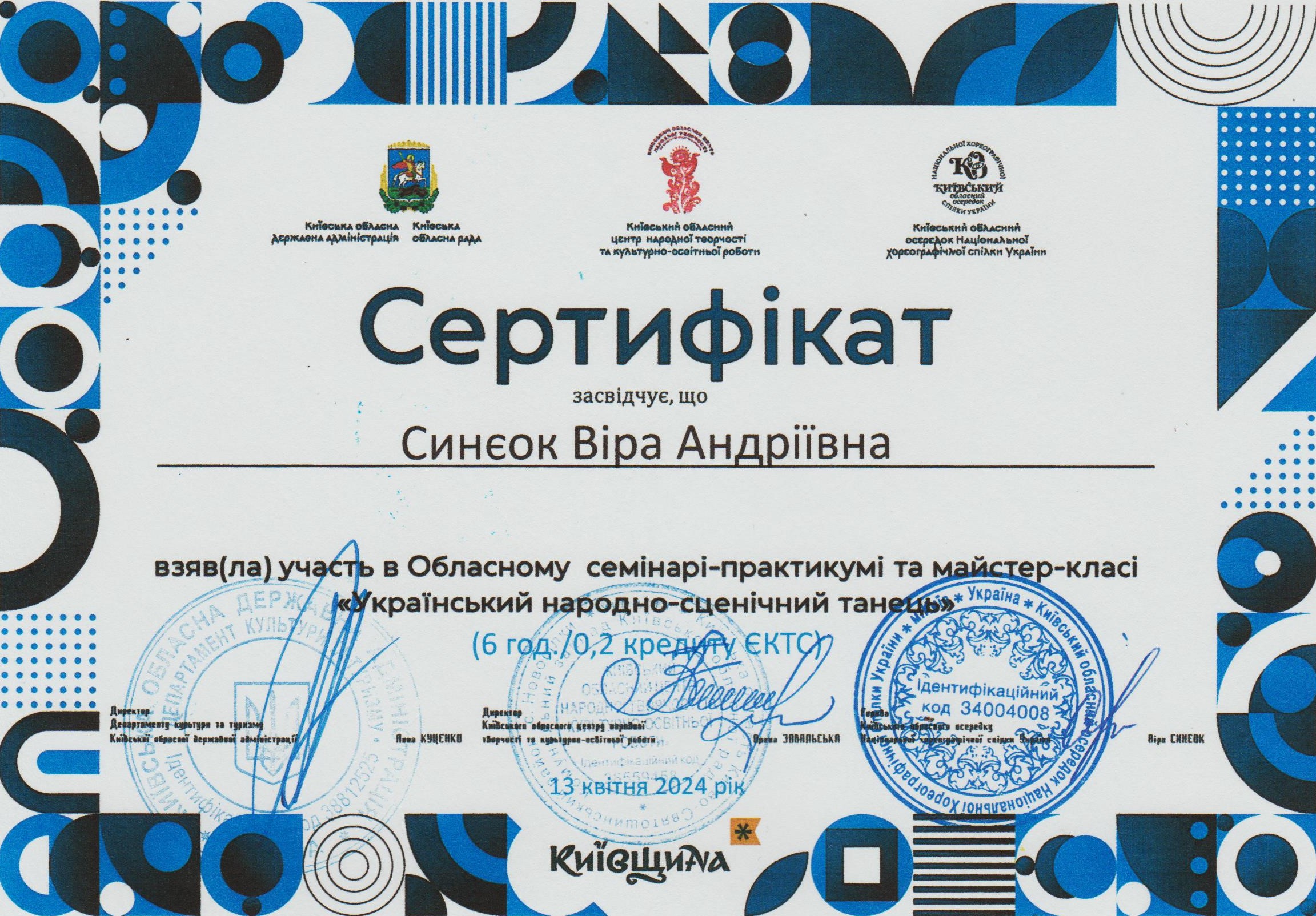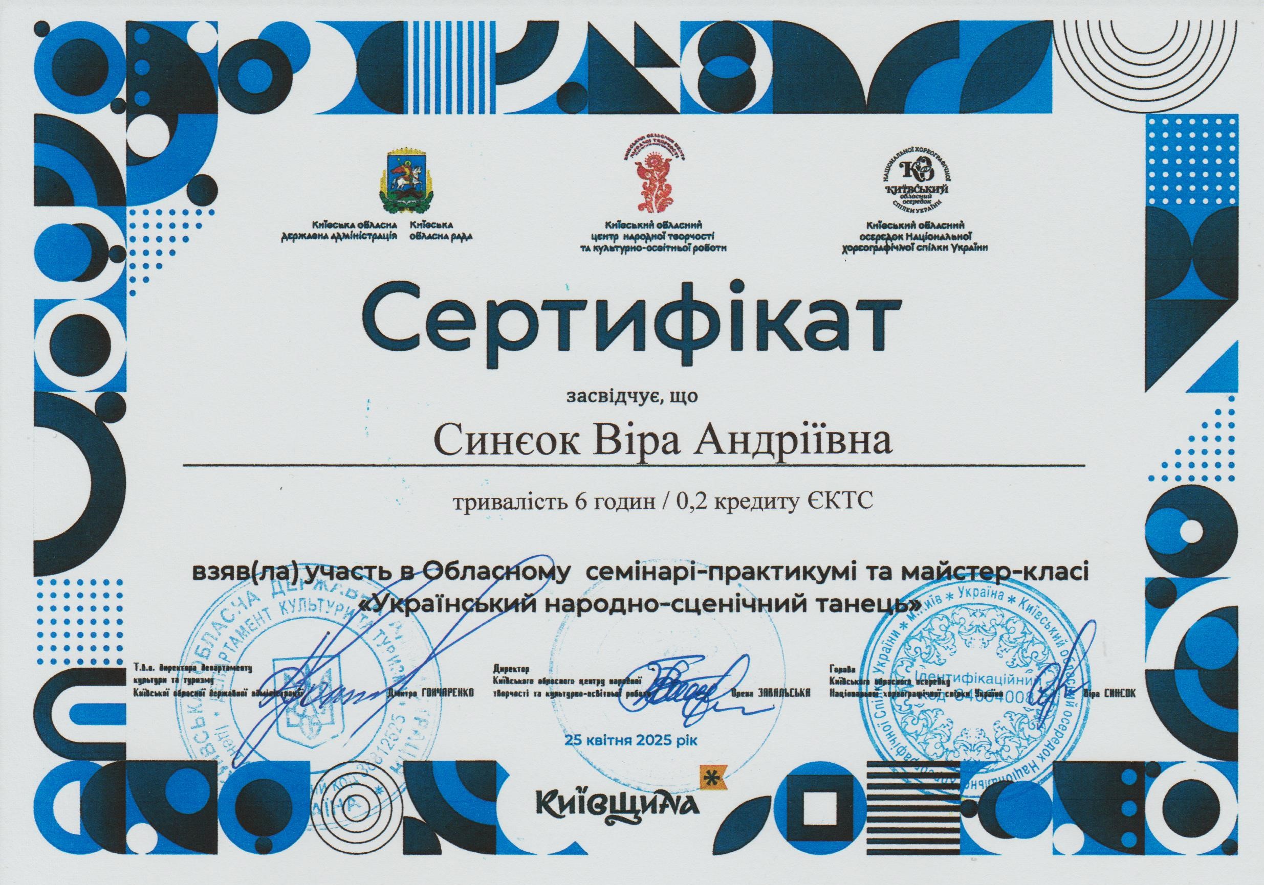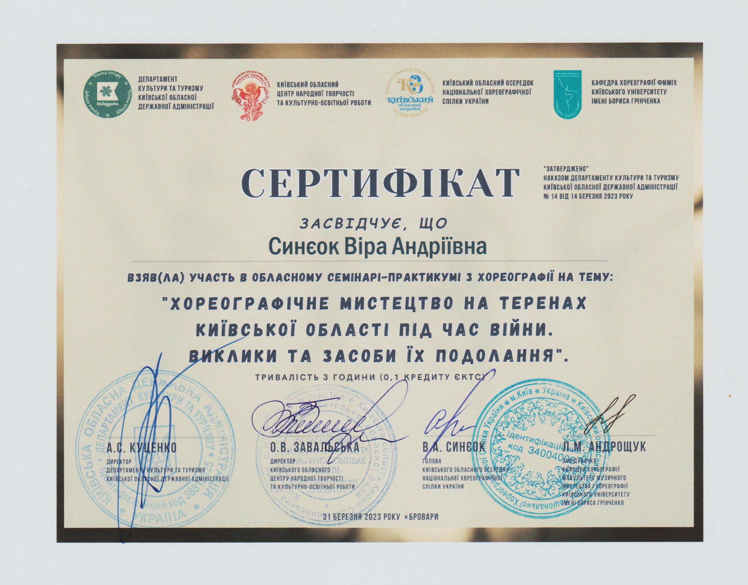 | 10188 | Семінар-практикум та майстер класи «Український народно-сценічний танець» | Система навчання та процес оволодіння мистецтвом українського народного танцю в дитячих аматорських хореографічних колективах Київської області | Бориспіль |