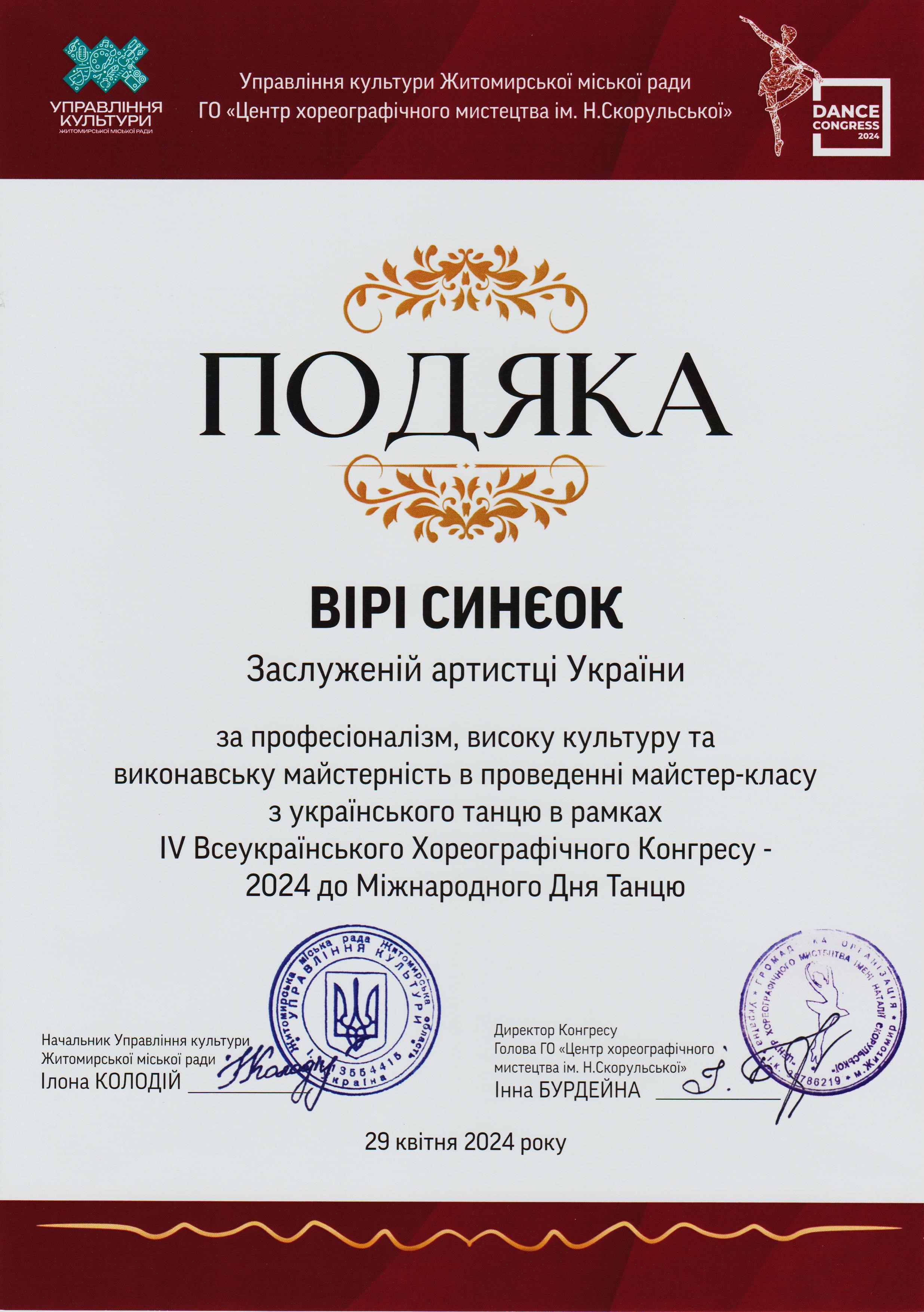 | 10312 | IV Благодійний Всеукраїнський хореографічний Конгрес до Міжнародного Дня Танцю «Dance Congress 2024» | Особливості виконання лексики танців та віртуозної техніки центрального регіону України | Житомир |