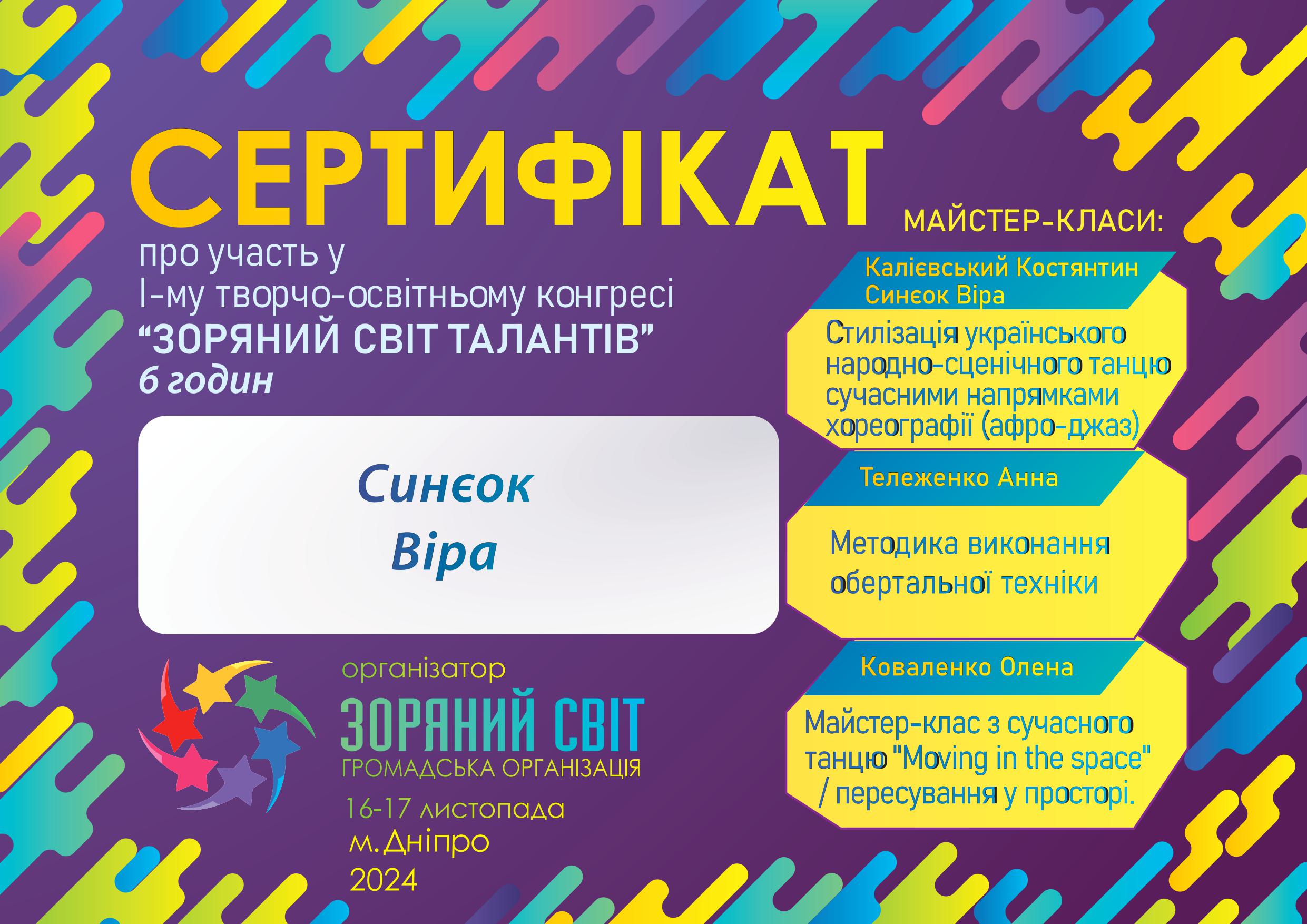 | 11031 | І-й творчо-освітній конгрес «Зоряний світ талантів» | Стилізація українського народно-сценічного танцю сучасними напрямками хореографії (афро-джаз) | Дніпро |