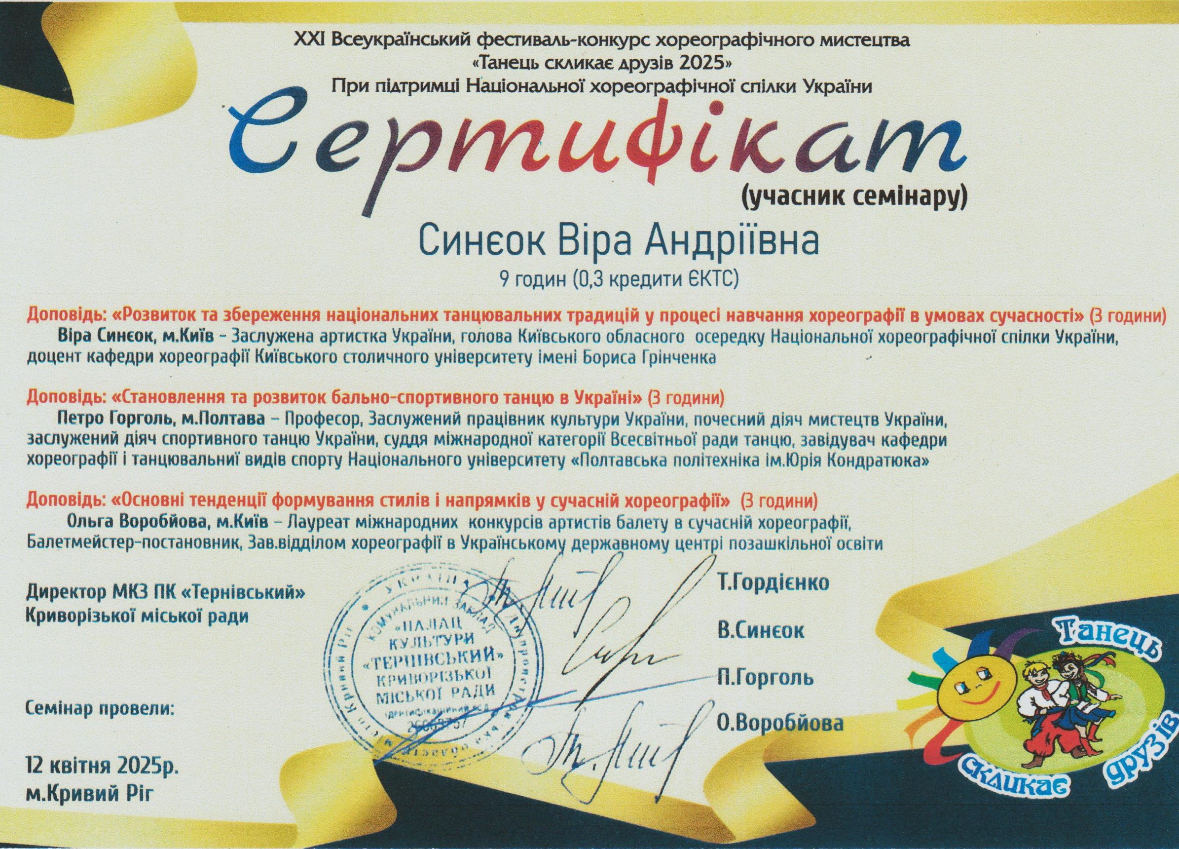| 11739 | Науково-практична конференція до ХХІ Всеукраїнського фестивалю-конкурсу хореографічного мистецтва "Танець скликає друзів 2025" | Розвиток та збереження національних танцювальних традицій у процесі навчання хореографії в умовах сучасності | Кривий Ріг |