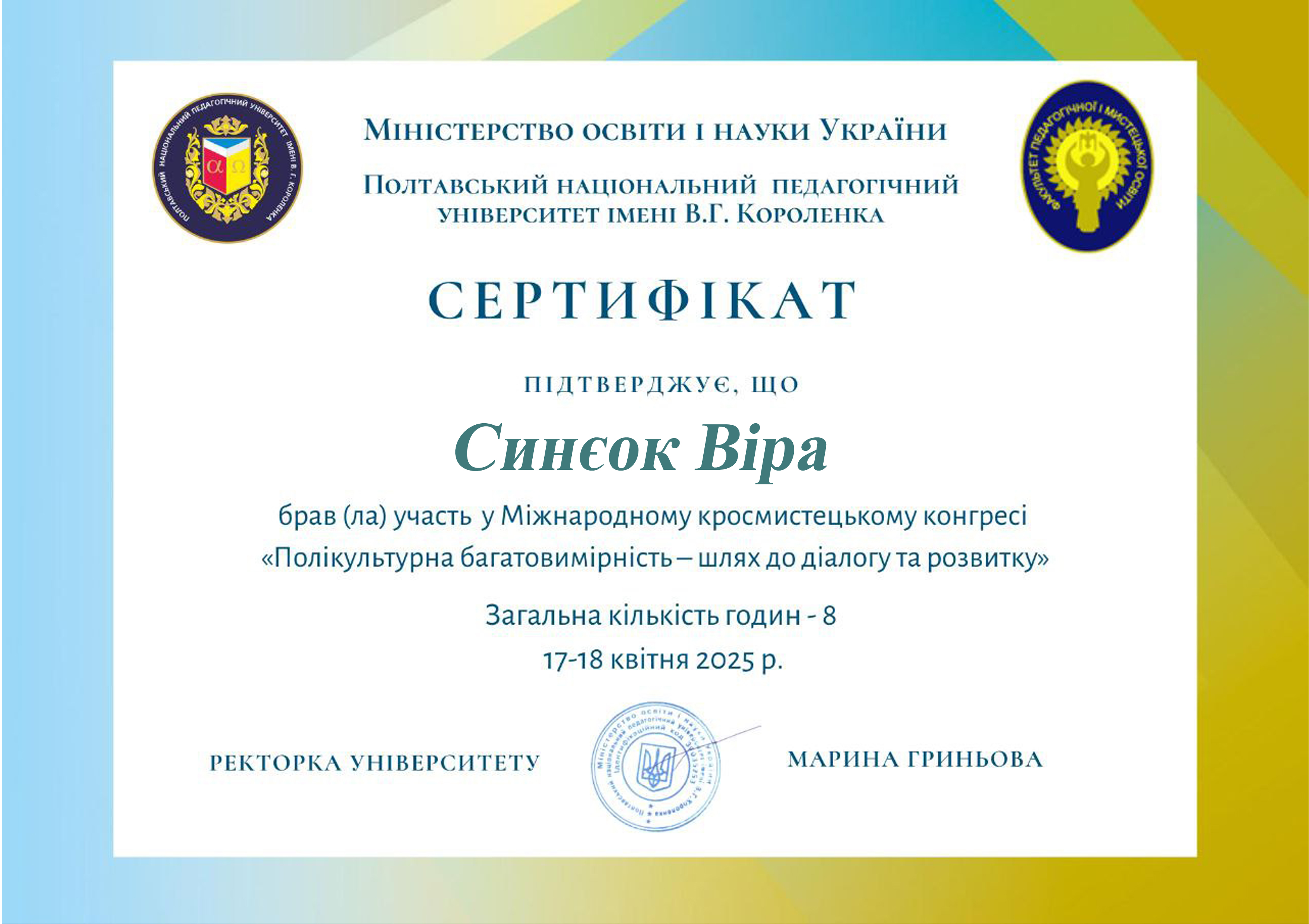 | 11792 | Міжнародний кросмистецький конгрес «Полікультурна багатовимірність – шлях до діалогу і розвитку» | Національна ідея – вектор хореографічного виховання | Полтава |