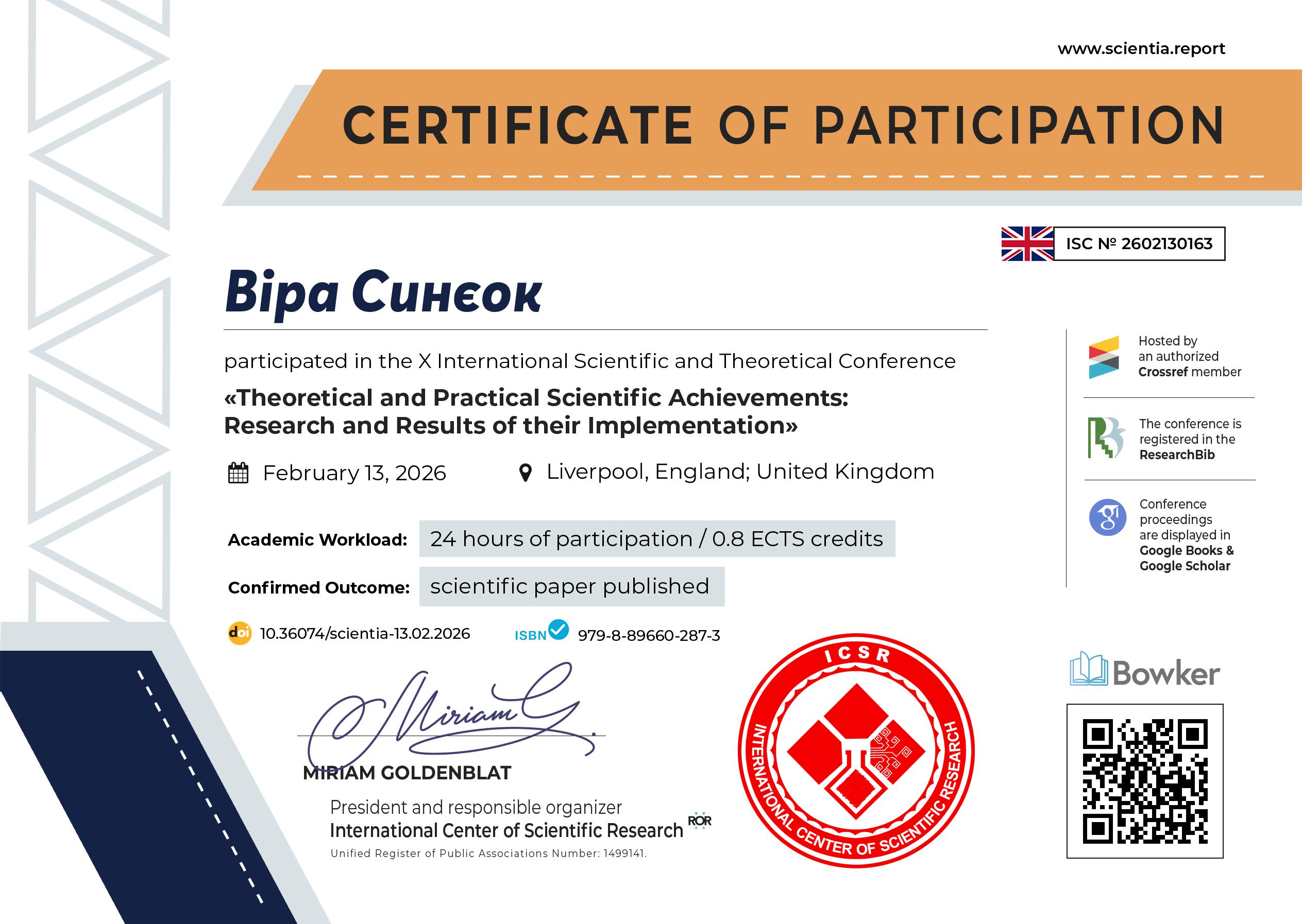 | 13104 | X Міжнародна науково-теоретична конференція «Theoretical and Practical Scientific Achievements: Research and Results of their Implementation» | Методичні засади в роботі бального танцювального колективу | Ліверпуль |