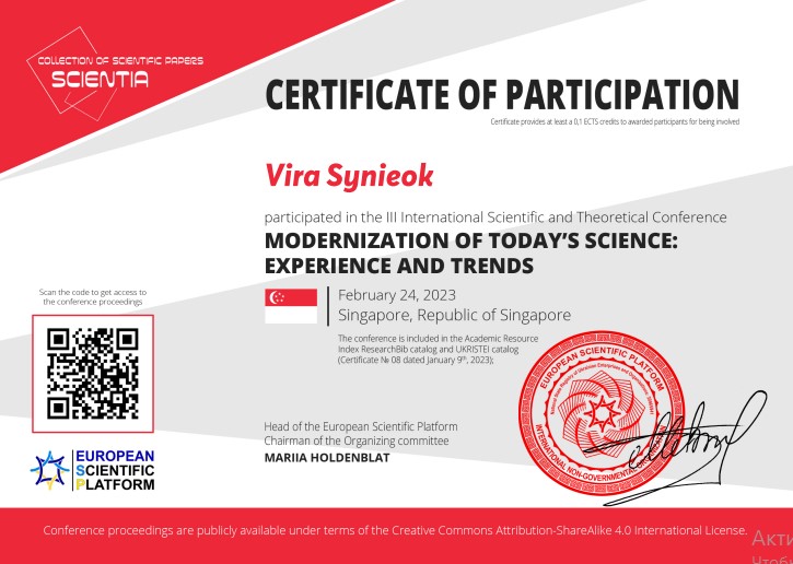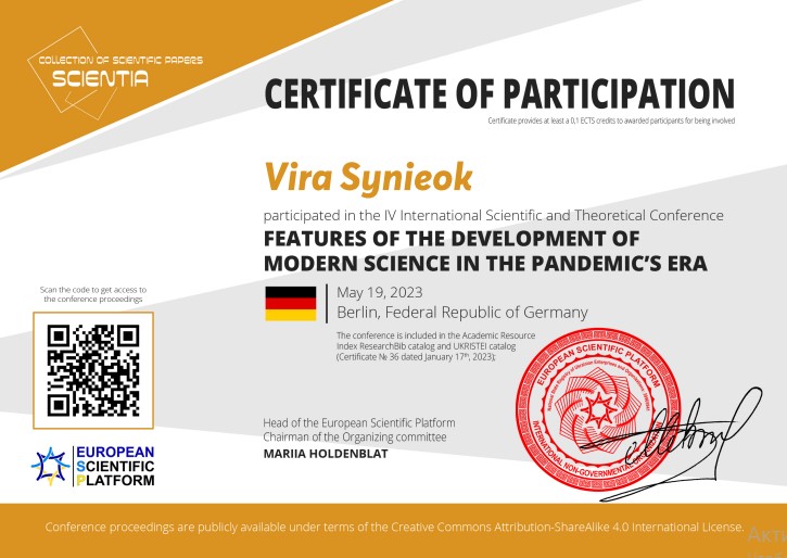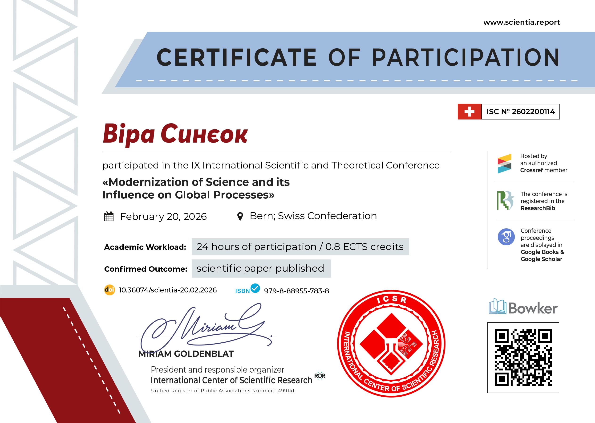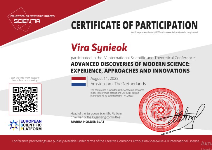 | 13067 | VII Міжнародна науково-теоретична конференція «Modern Vision of Implementing Innovations in Scientific Studies» | Педагогічні підходи у роботі з дошкільнятами в хореографічному колективі | Марсель |