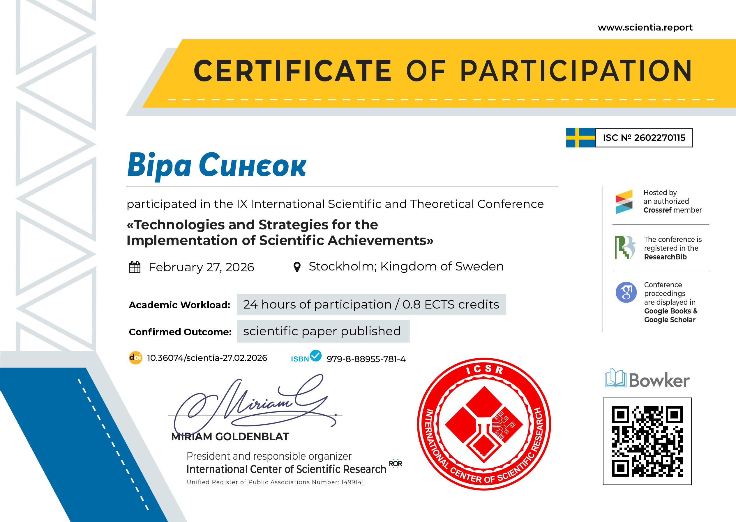 | 13126 | IX Міжнародна науково-теоретична конференція «Technologies and Strategies for the Implementation of Scientific Achievements» | Роль мотивації у роботі з хореографічним колективом | Стокгольм |