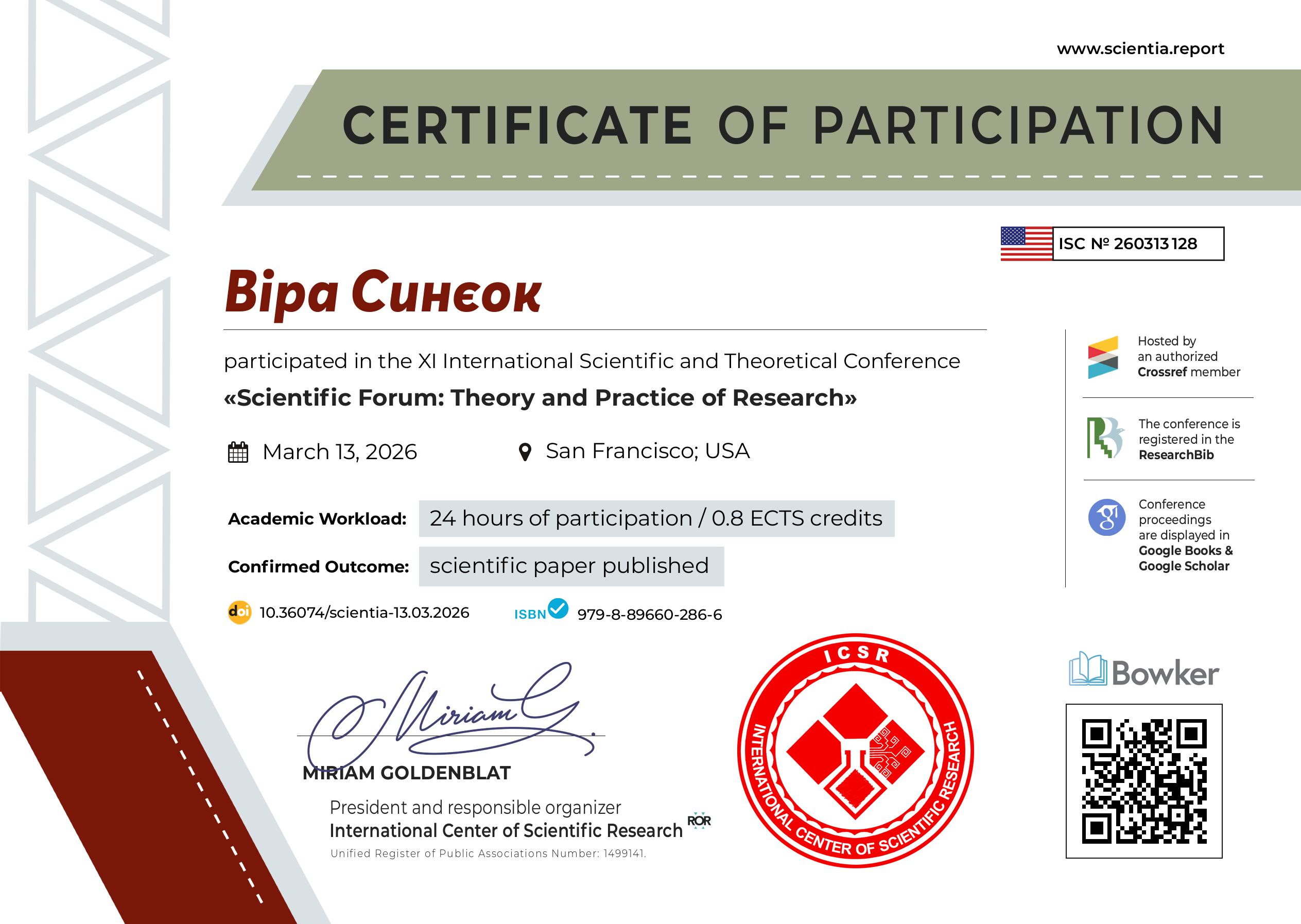 | 13187 | XI Міжнародна науково-теоретична конференція «Scientific Forum: Theory and Practice of Research» | Розкриття творчого потенціалу дитини засобами хореографічного мистецтва | Сан-Франциско |