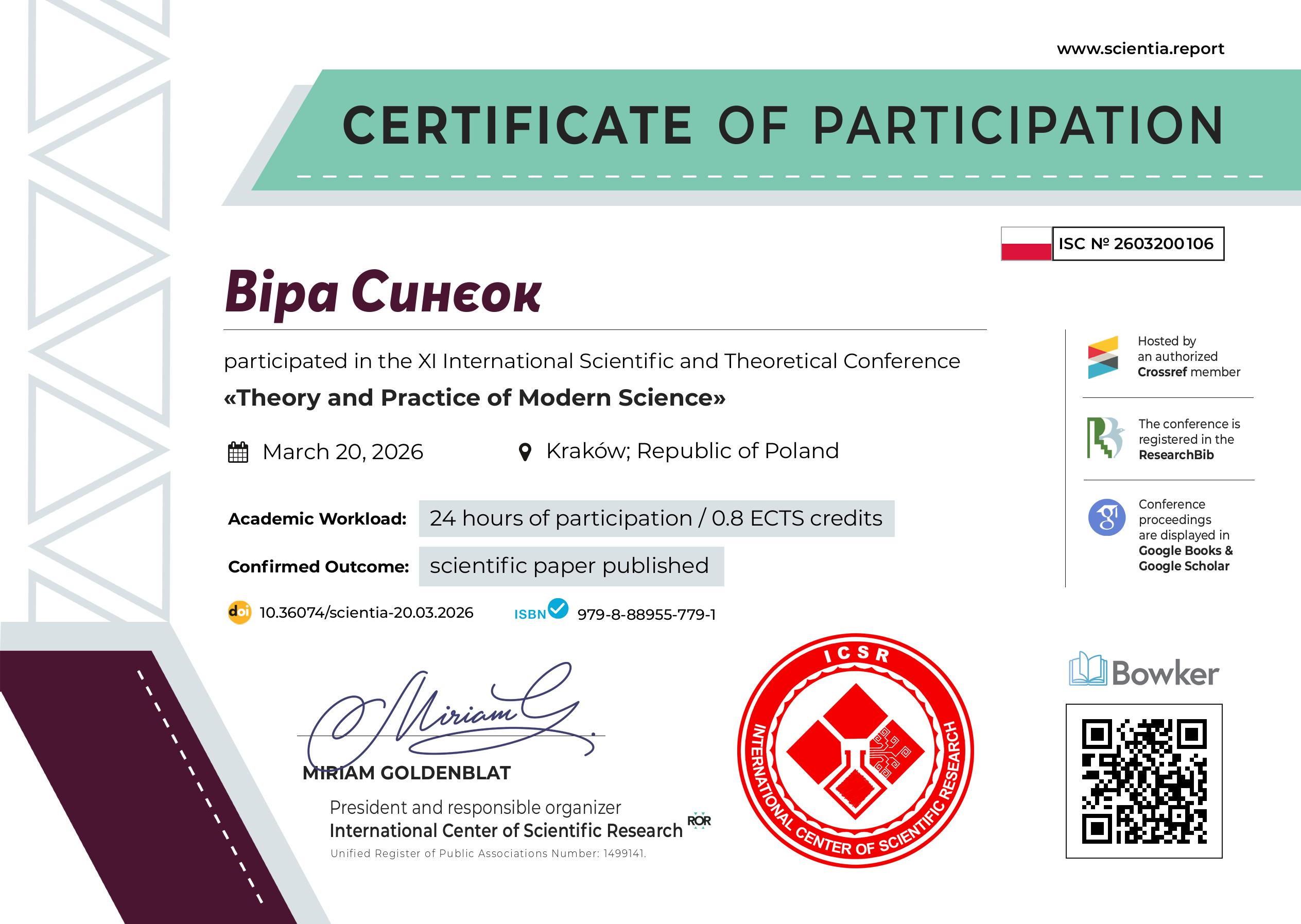 | 13188 | XI Міжнародна науково-теоретична конференція «Theory and Practice of Modern Science» | Хореографія як засіб розвитку творчих здібностей дітей | Краків |