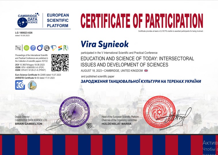 | 9451 | V Міжнародна науково-практична конференція «Education and science of today: intersectoral issues and development of sciences» | Зародження танцювальної культури на теренах України | Кембридж |