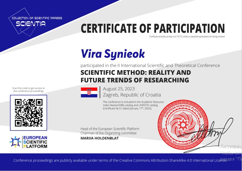 | 9464 | II Міжнародна науково-теоретична конференція «Scientific method: reality and future trends of researching» | Шлях відродження аматорських народних колективів на прикладі ансамблю «Чорнобривець» | Загреб |