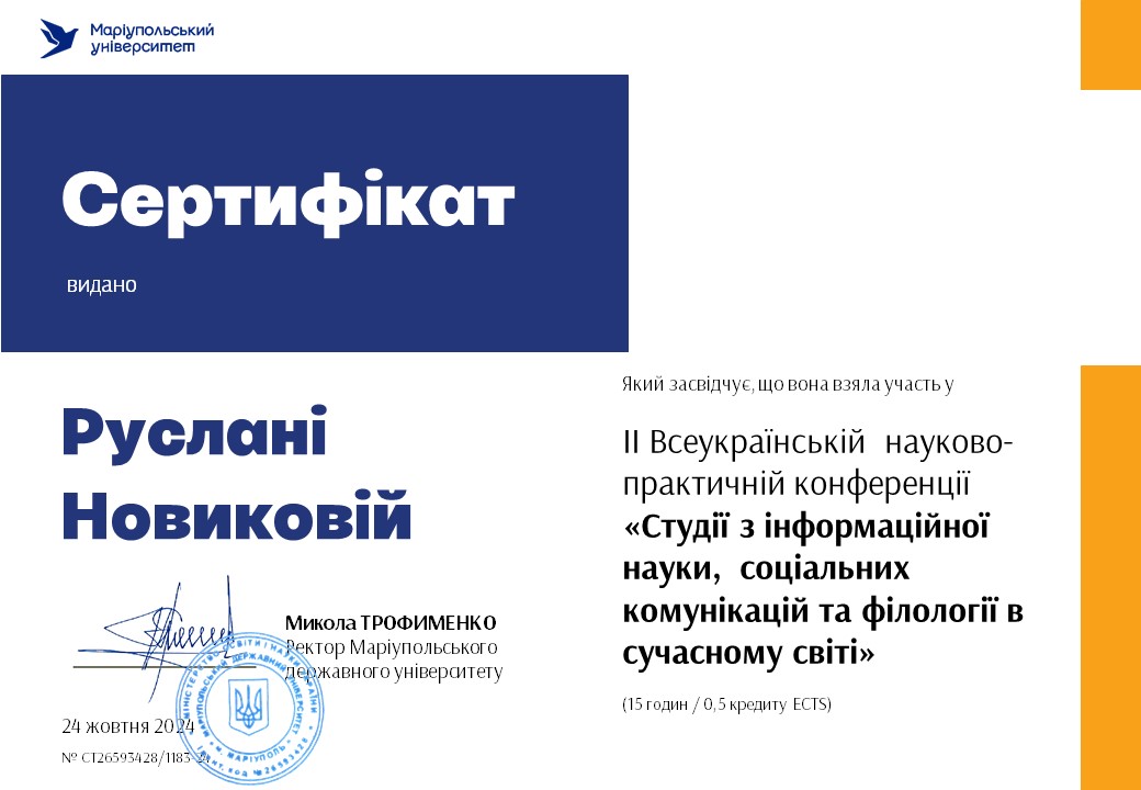 | 12 | Факультет української філології, культури і мистецтва | Кафедра інформаційних комунікацій | 2024 | Всеукраїнський конкурс творчих робіт учнівської та студентської молоді «СОФІТ» | 23.12.2024 00:00 |