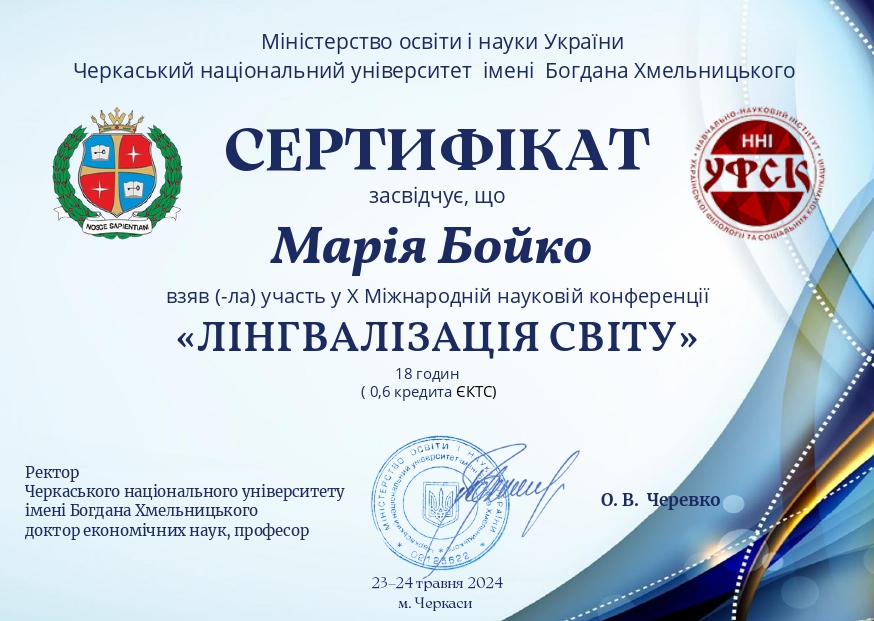 | 10606 | Х Міжнародна конференція "Лінгвалізація світу" | Неосемантизми як репрезентанти воєнного дискурсу | Черкаси |