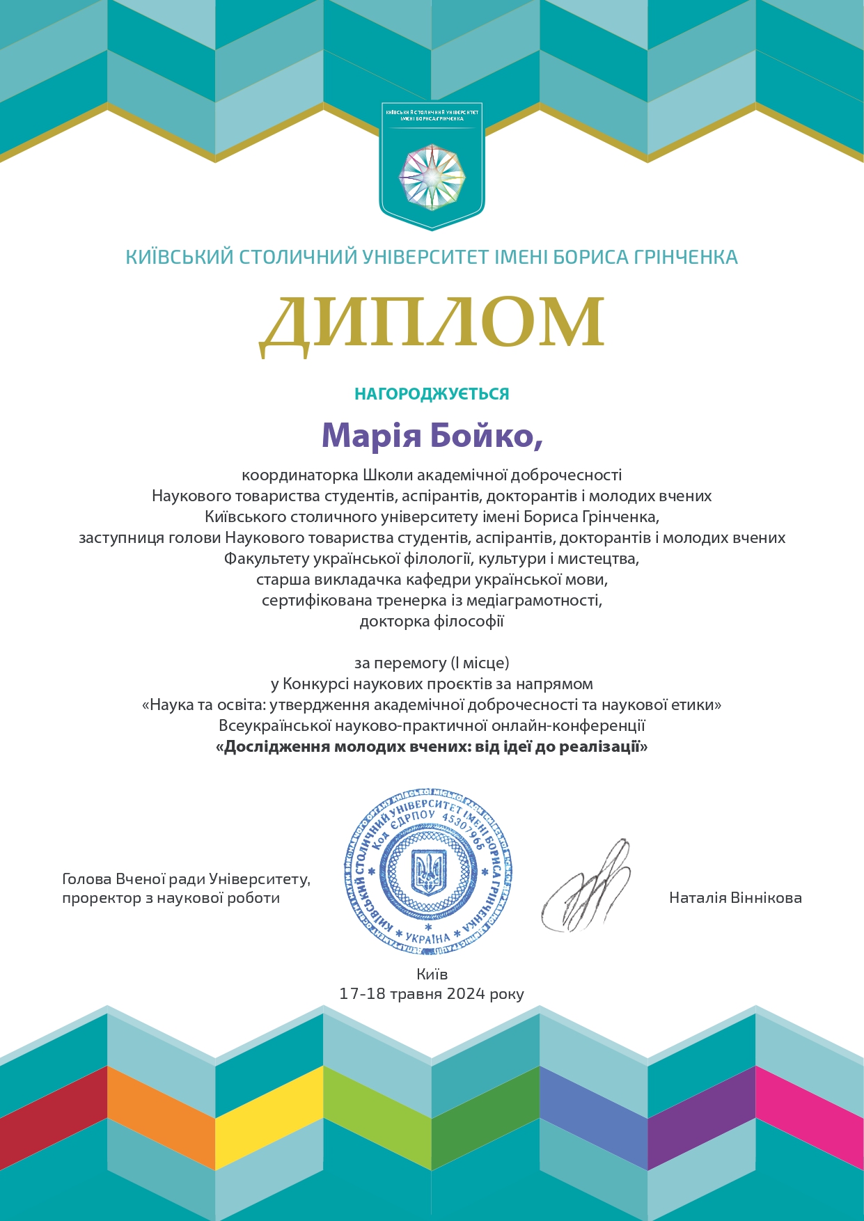 | 25 | Факультет української філології, культури і мистецтва | Кафедра української мови | Конкурс «Лідер українства: шлях Бориса Грінченка в Україні» | 2024 |