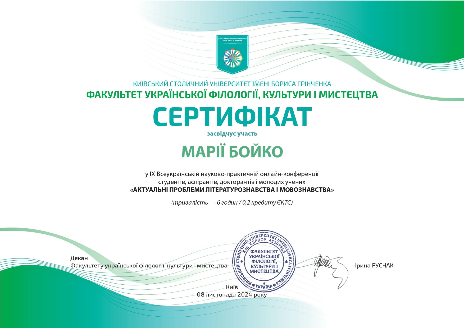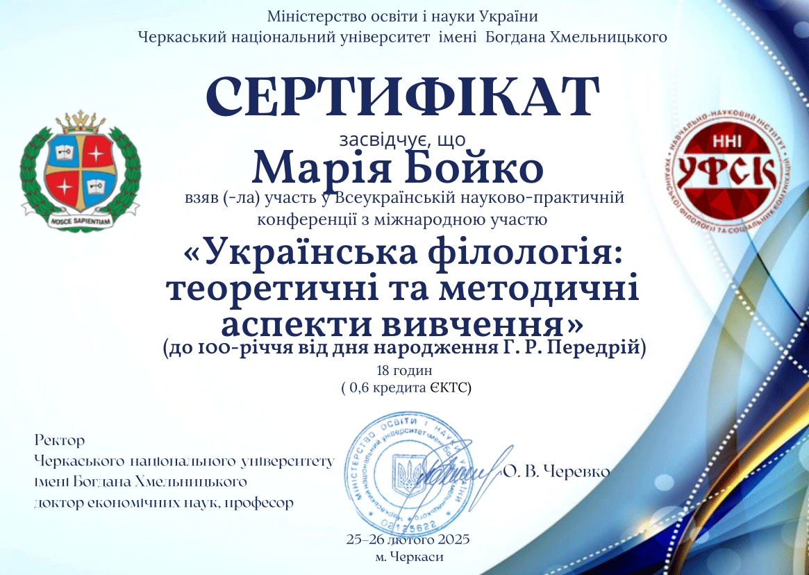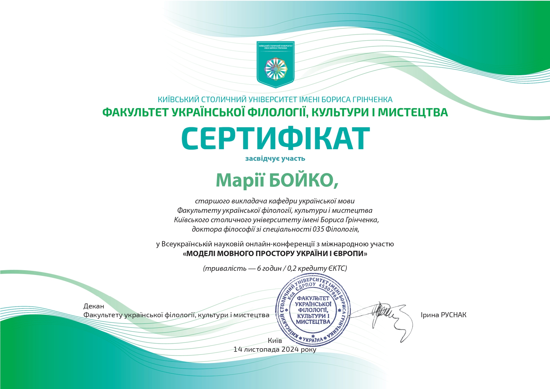 | 729 | Факультет української філології, культури і мистецтва | Кафедра української мови | 26.3 | 2 | 2025 | https://www.researchgate.net/profile/Mariia-Boiko-2 |