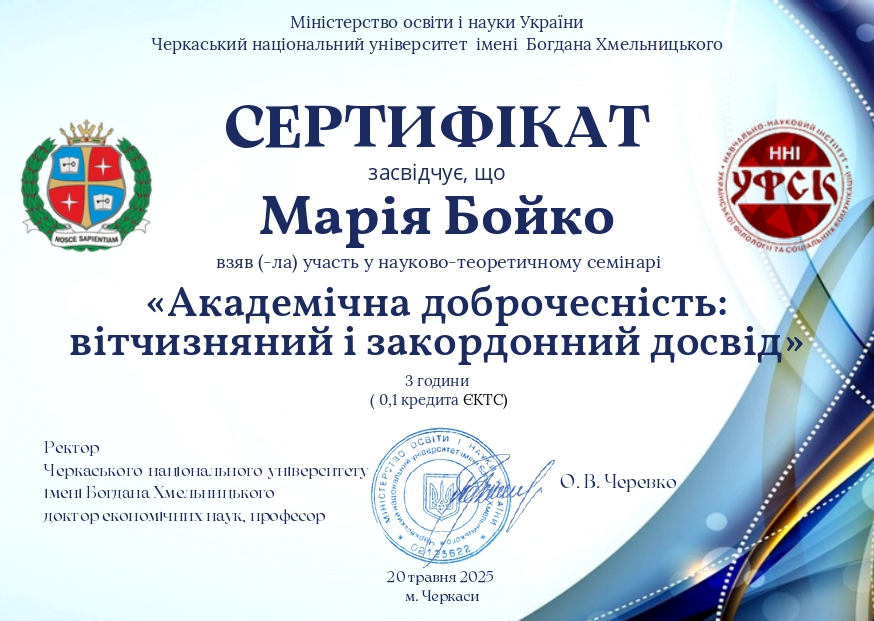 | 11958 | Всеукраїнський науково-теоретичний семінар «АКАДЕМІЧНА ДОБРОЧЕСНІСТЬ: ВІТЧИЗНЯНИЙ І ЗАКОРДОННИЙ ДОСВІД» | Доброчесність як новий стандарт лідерства | Черкаси, Україна |