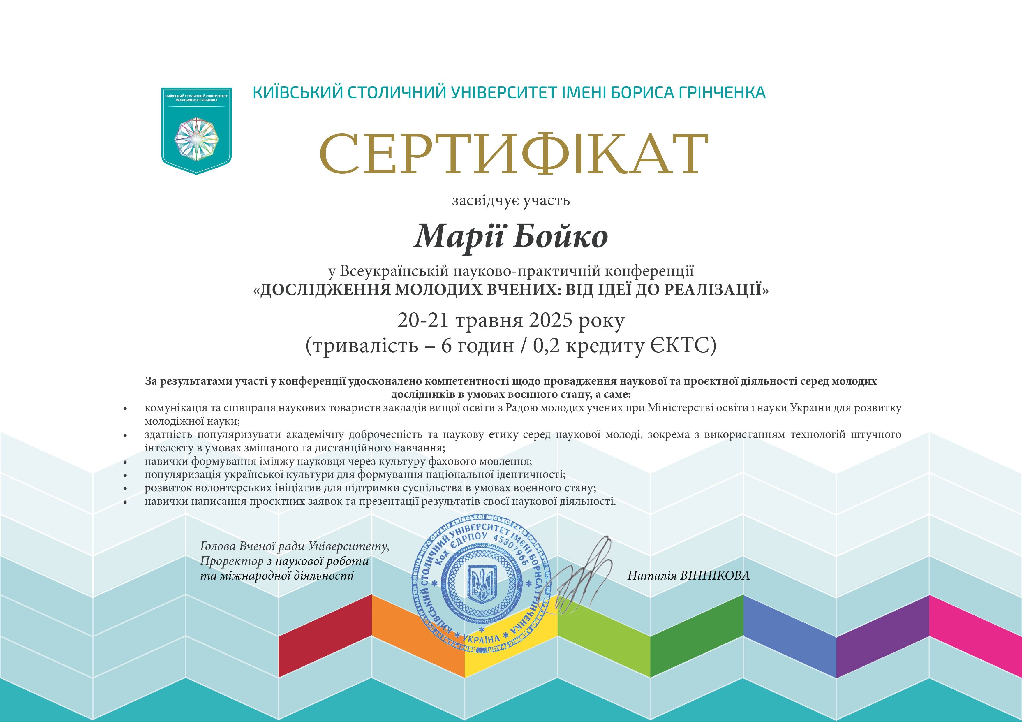 | 10607 | Всеукраїнська науково-практична онлайн-конференція: «Дослідження молодих вчених: від ідеї до реалізації» | Конкурс наукових проєктів | Київський університет імені Бориса Грінченка |