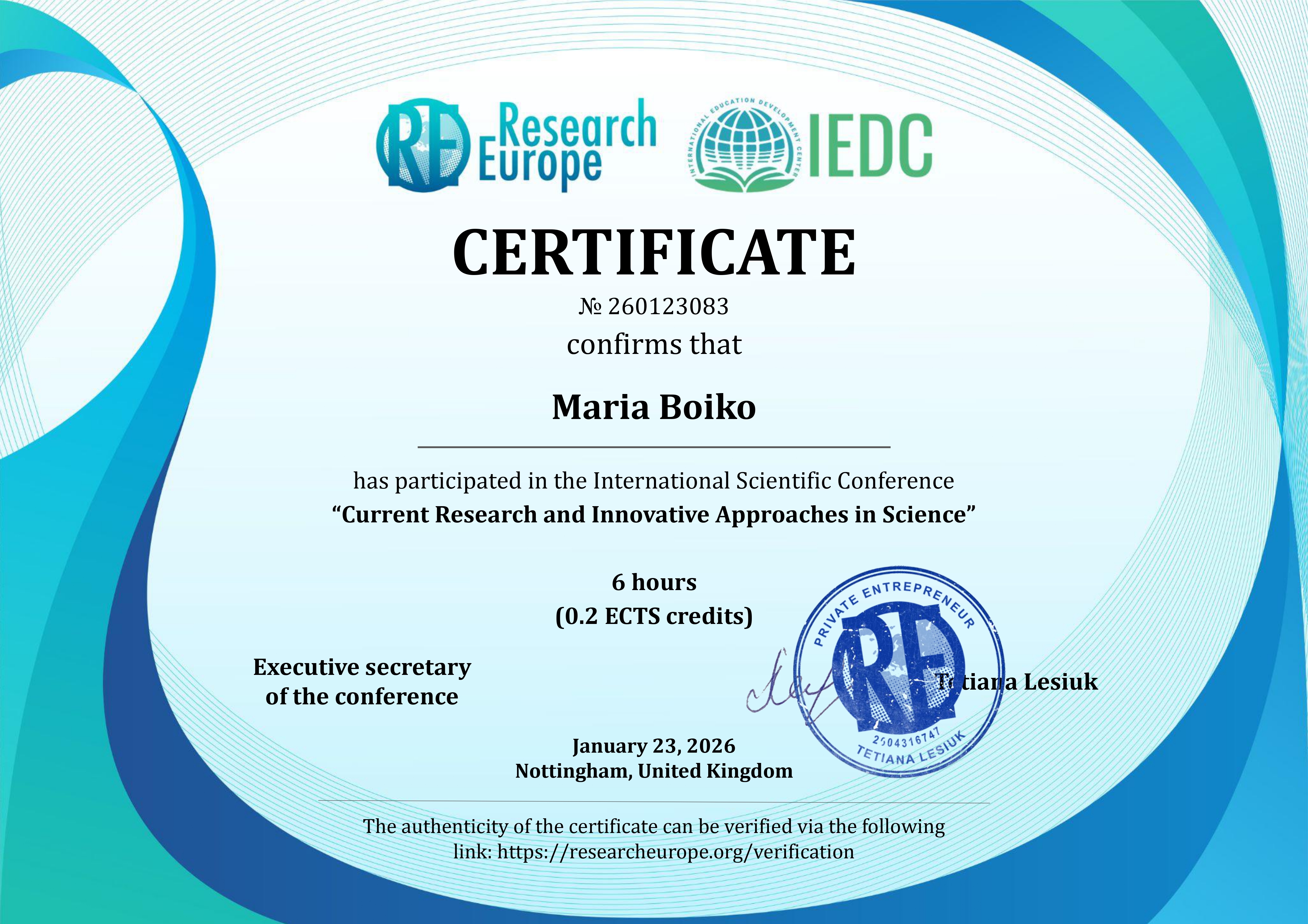 | 13069 | Міжнародна наукова конференція “Сучасні дослідження та інноваційні підходи в науці” | Improving the language competence of teachers in Kyiv: results of a sociolinguistic survey | Ноттінгем, Велика Британія |