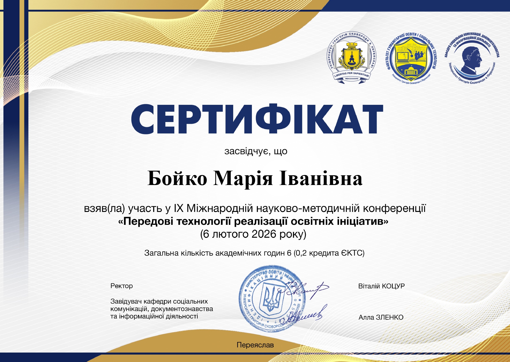 | 13094 | ІХ Міжнародна науково-методична конференція "Передові технології реалізації освітніх інціатив" | «Персоналізація мовної освіти в умовах цифровізації: креативні методи та нейромережеві технології | Переяслав, Україна |