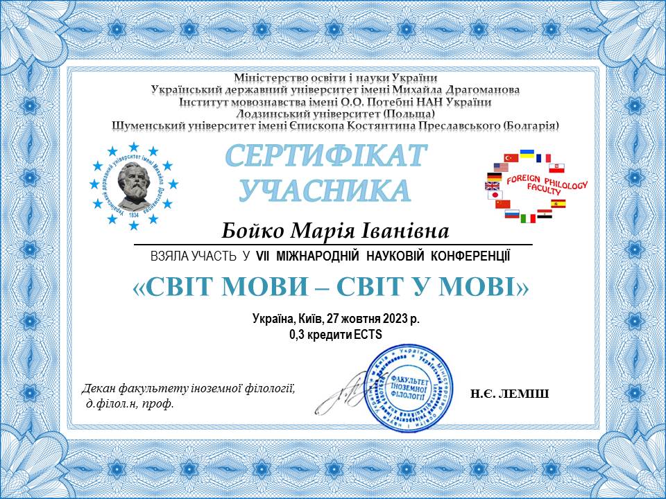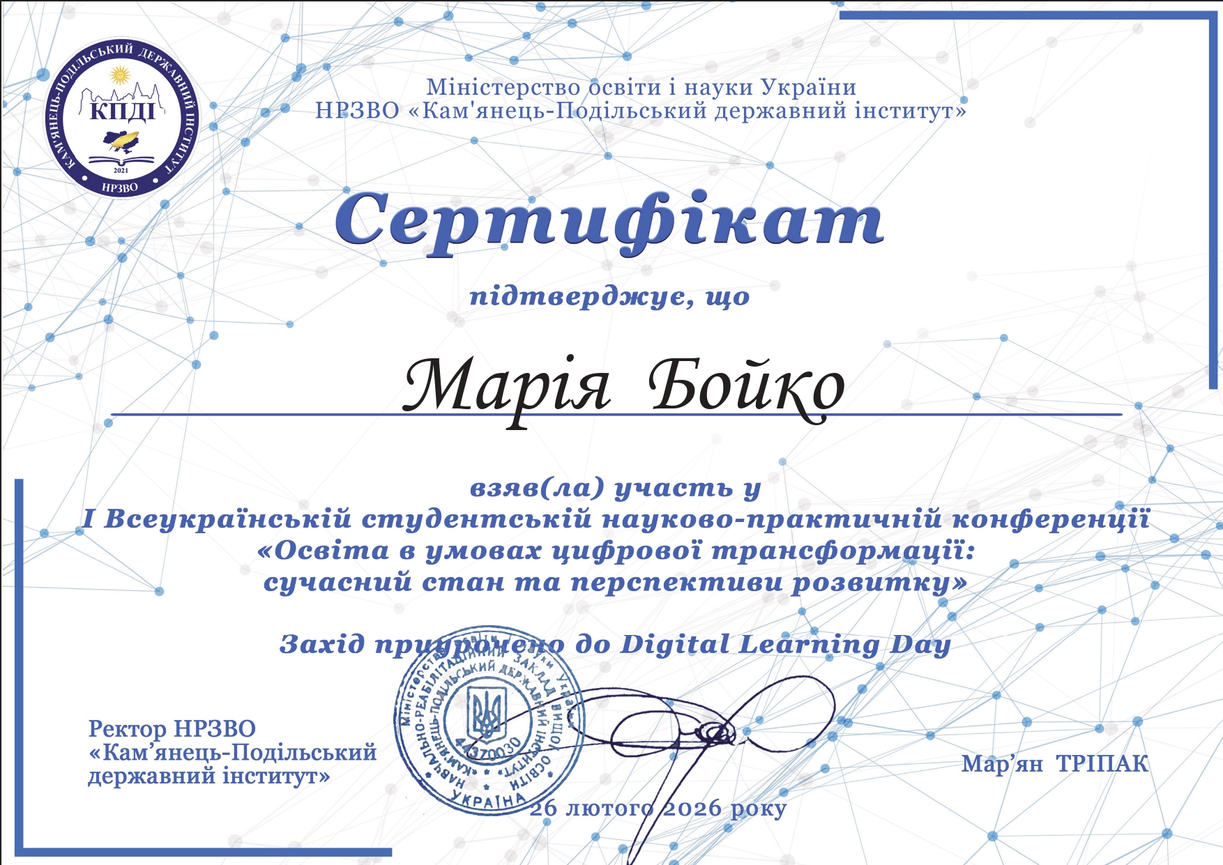 | 13189 | І Всеукраїнська студентська науково-практична конференція «Освіта в умовах цифрової трансформації: сучасний стан та перспективи розвитку» | Від друкованого словника до цифрової платформи: нові виміри лексикографії | Україна, Кам'янець-Подільський |