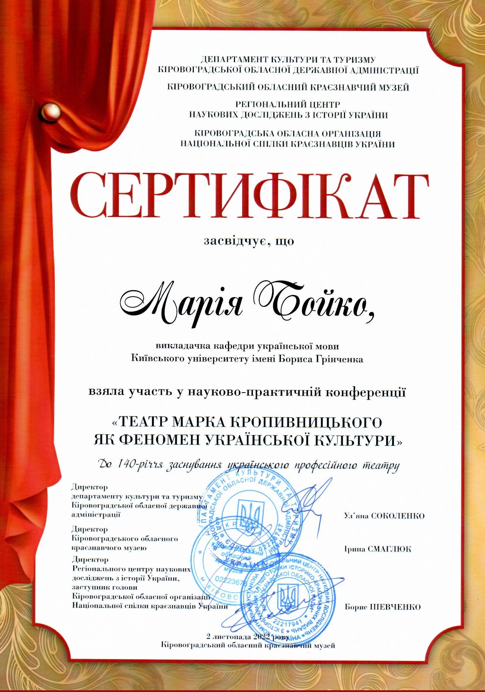 | 9444 | Науково-практична конференція «Театр Марка Кропивницького як феномен української культури» | Творча спадщина корифеїв у репертуарі театрів україни та світу | Кропивницький |
