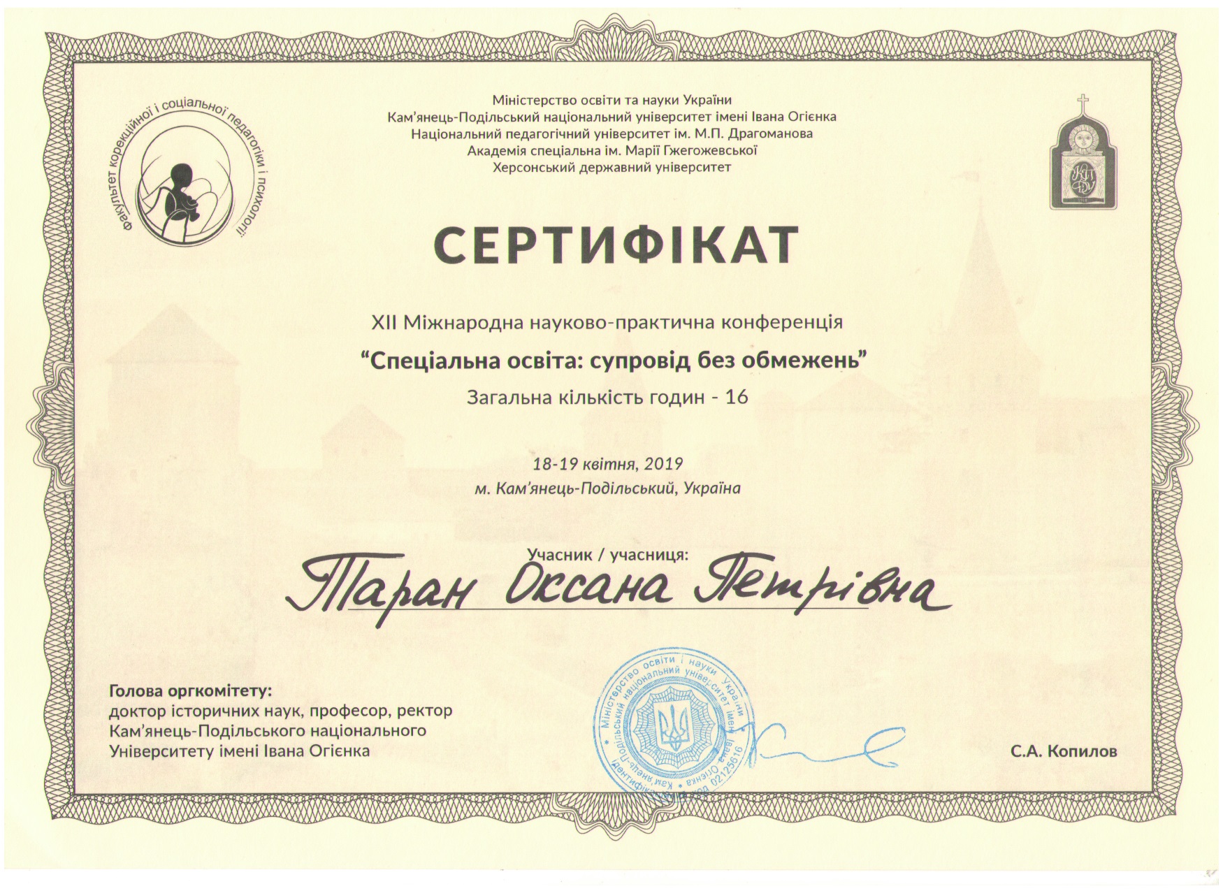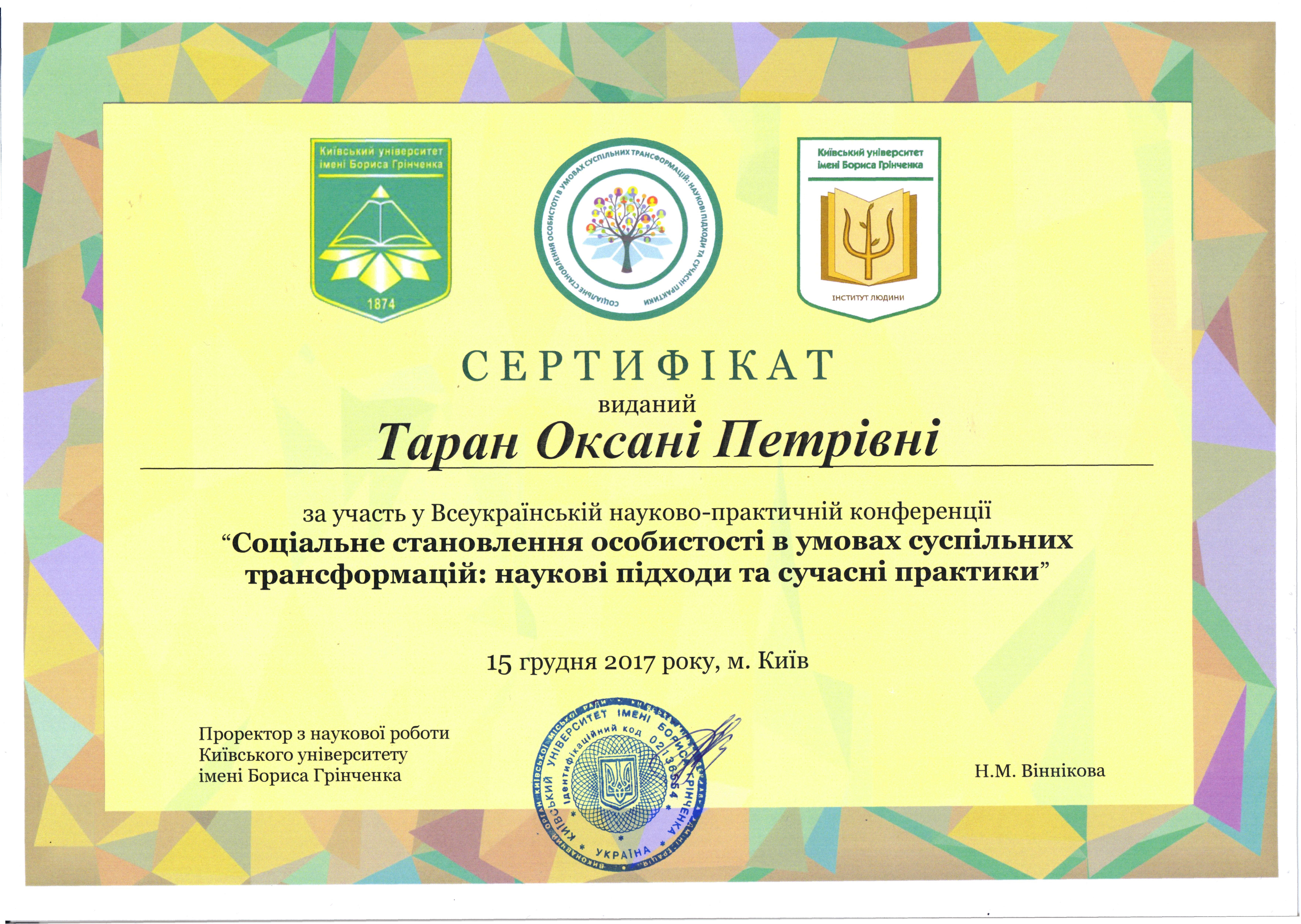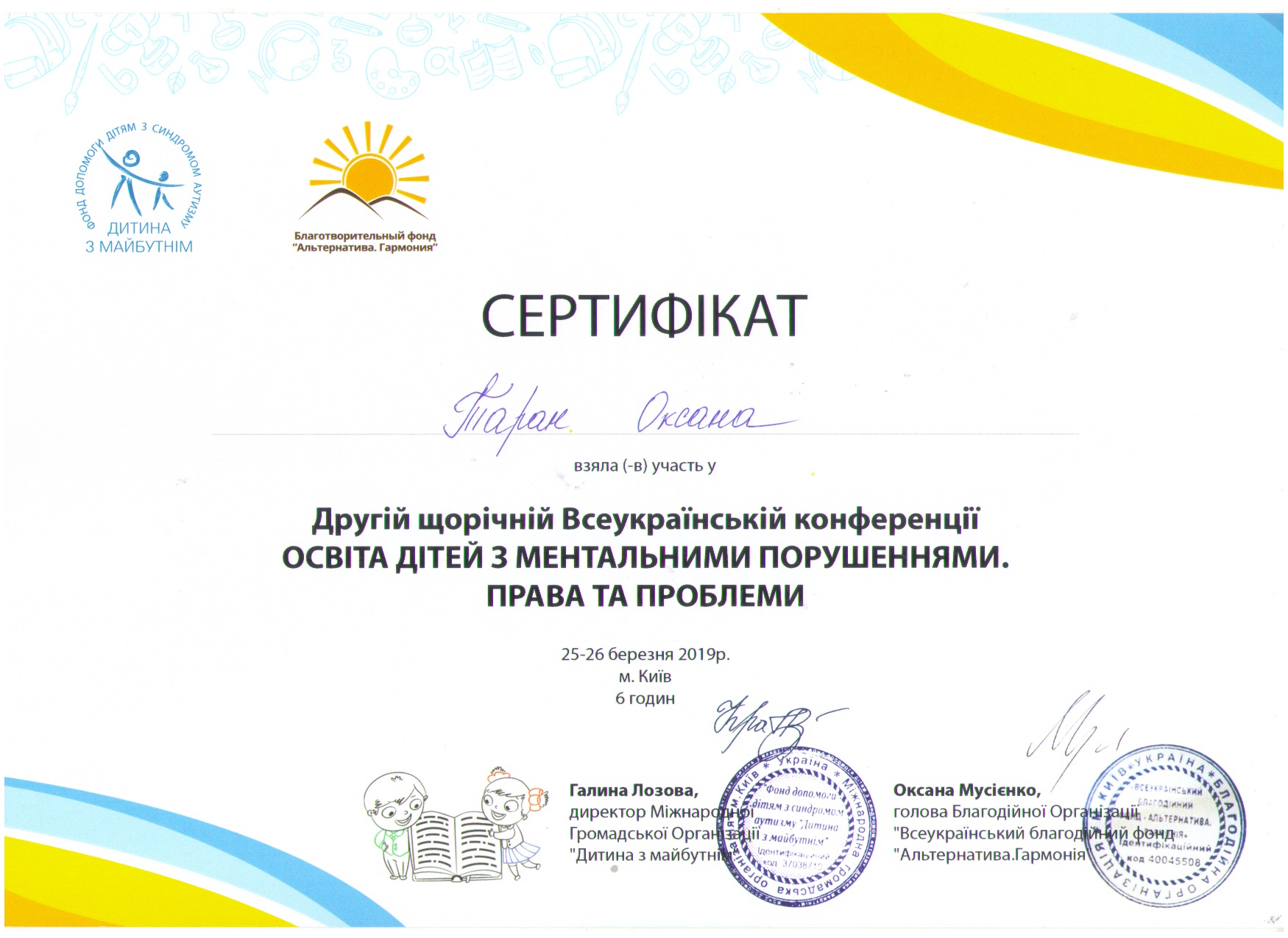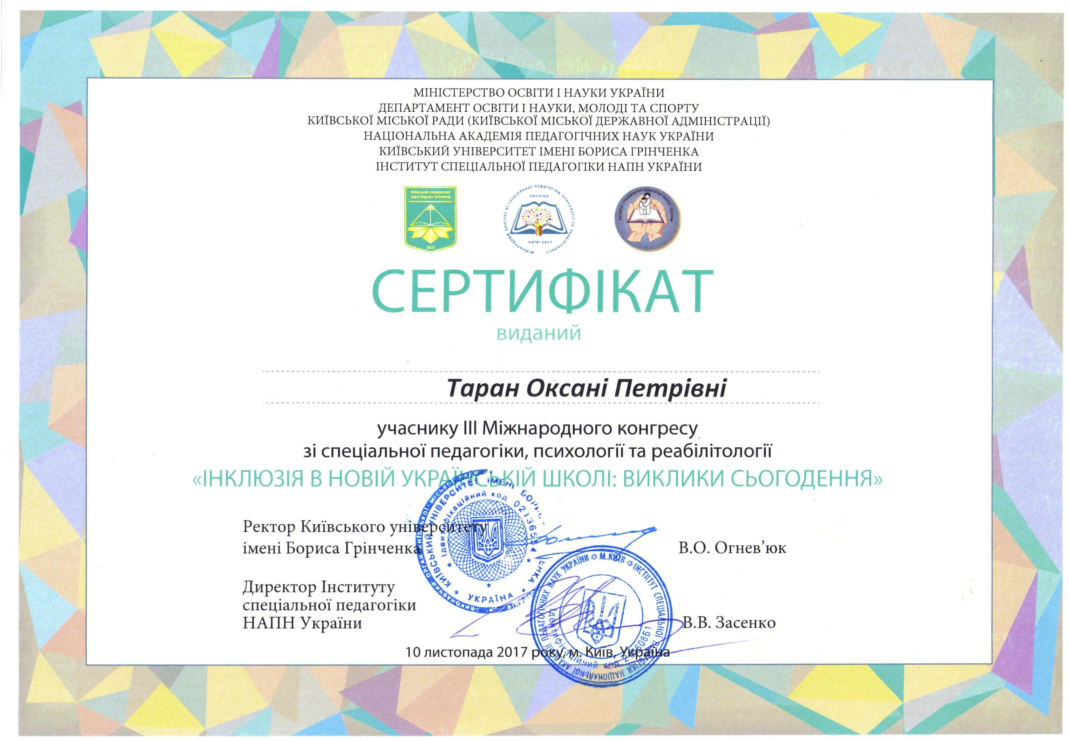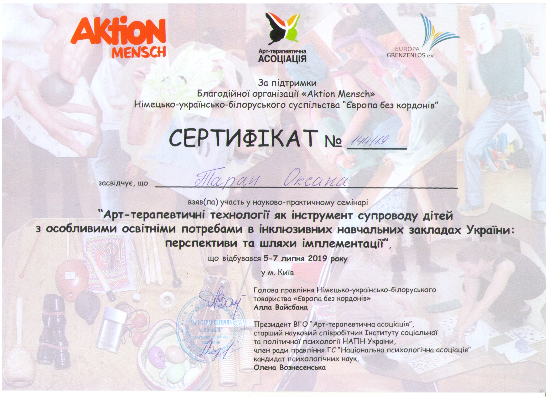 | 4818 | Науково-практичний семінар "Арт-терапевтичні технології як інструмент супроводу дітей з особливими освітніми потребамив інклюзивних навчальних закладах України: перспективи та шляхи імплементації" | Учасник конференції | м. Київ |