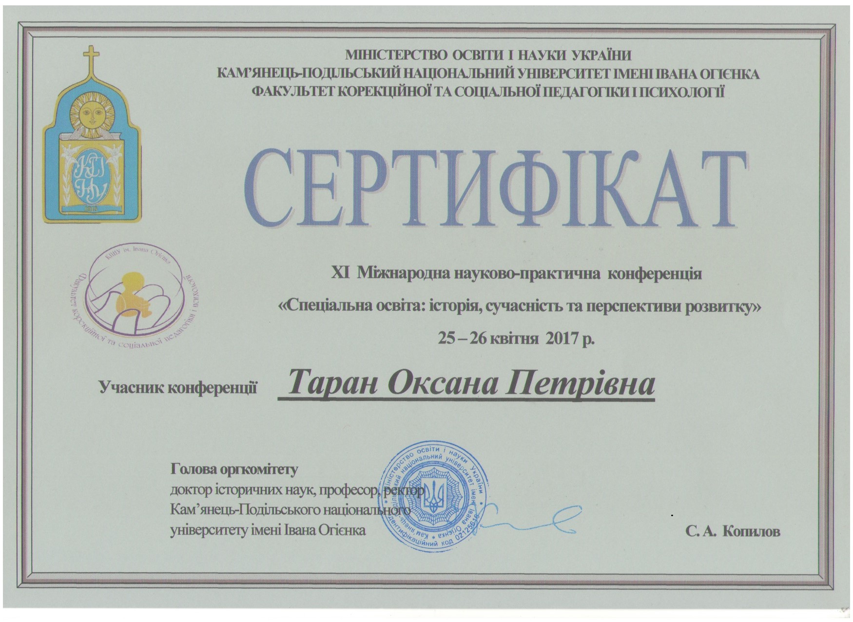 | 4817 | ХІІ Міжнародна науково-практична конференція "Спеціальна освіта: супровід без обмежень" | Особливості емоційної компетентності дітей старшого дошкільного віку із загальним недорозвитком мовлення | м. Кам'янець-Подільський |