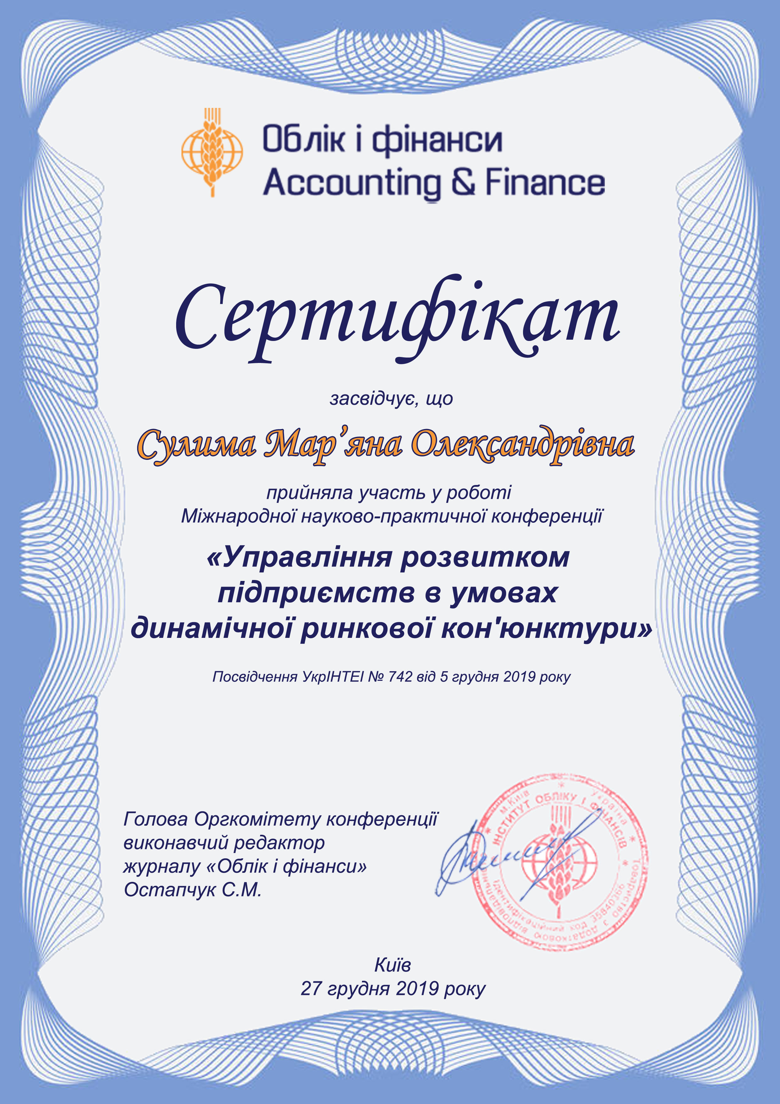 | 826 | Факультет економіки та управління | Кафедра фінансів | 83.4 | 2 | 2025 | https://www.researchgate.net/profile/Mariana-Sulyma/stats |