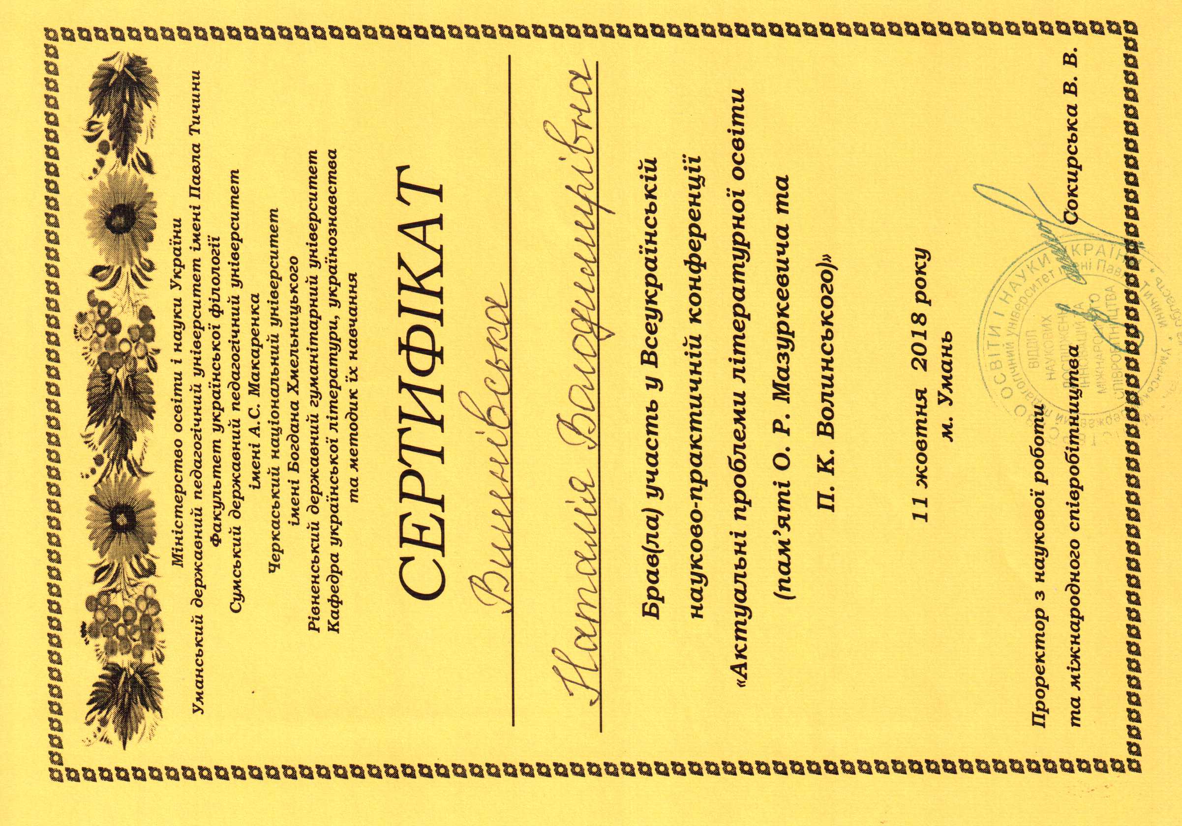 | 3315 | Всеукраїнська науково-практична конференція "Актуальні проблеми літературної освіти (пам'яті О.Р. Мазуркевича та П.К. Волинського)" | Формування громадянської компетентності молодших школярів на уроках літературного читання | м. Умань |