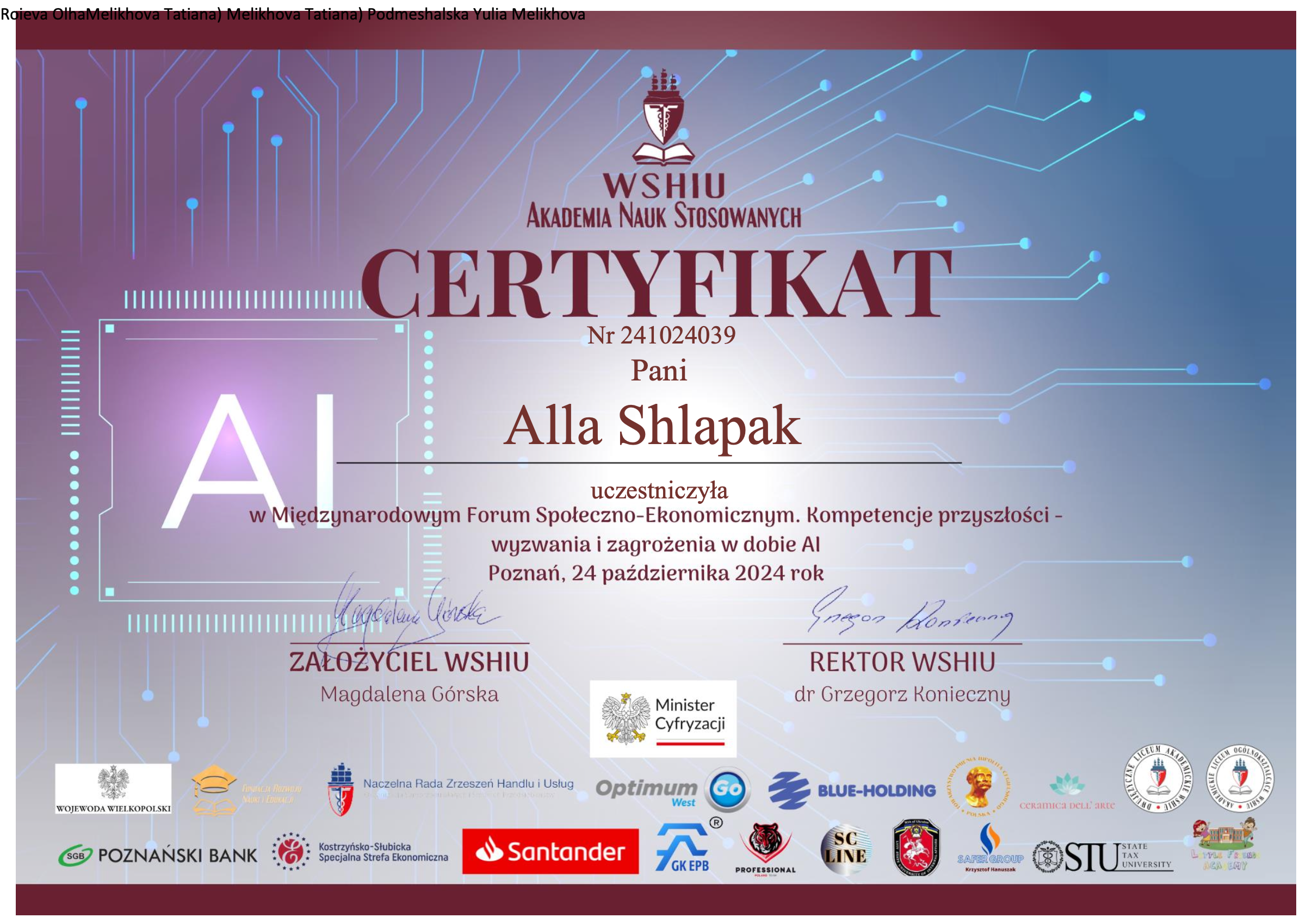 | 10834 | Międzynarodowe Forum Spoteczno-Ekonomicznym. Kompetencje przysztosci - wyzwania i zagrozenia w dobie Al | - | Poznań, Polska |