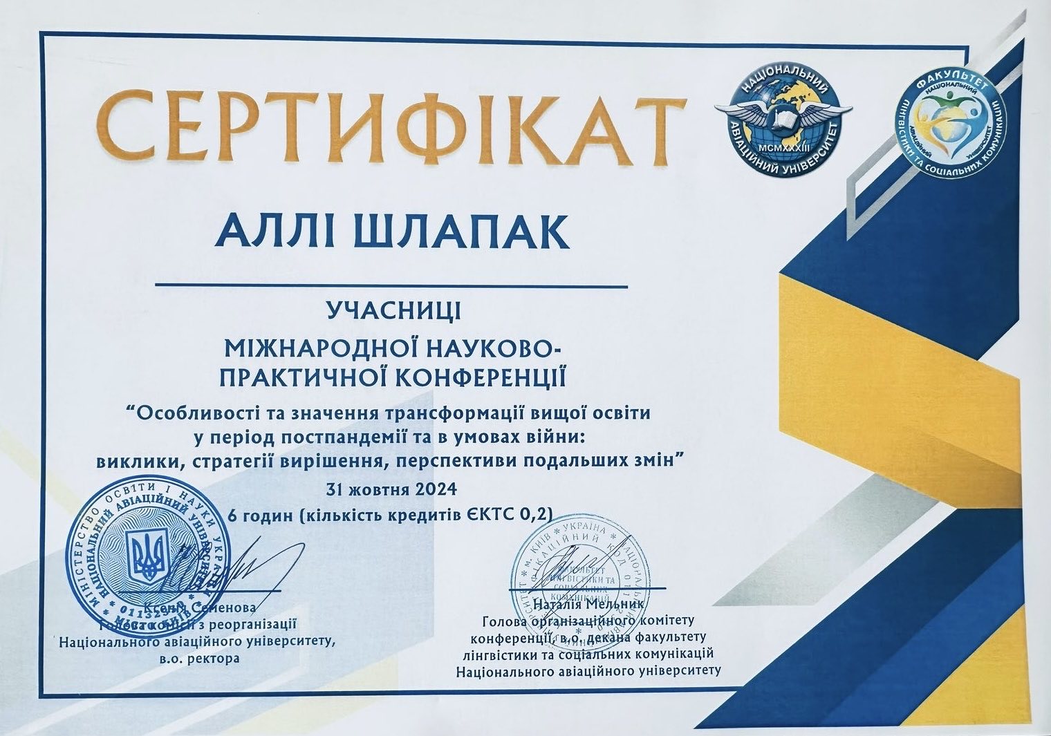 | 11752 | Особливості та значення трансформації вищої освіти у період постпандемії та в умовах війни: виклики, стратегії вирішення, перспективи подальших змін | - | Національний авіаційний університет |