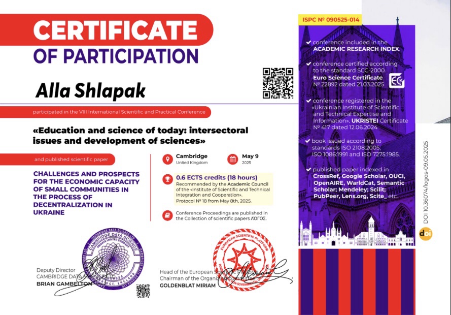 | 11821 | Education and science of today: intersectoral issues and development of sciences | Challenges and Prospects for the Economic Capacity of Small Communities in the Process of Decentralization in Ukraine | Cambridge, United Kingdom |