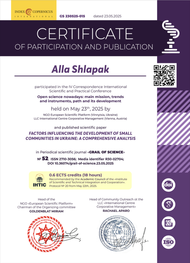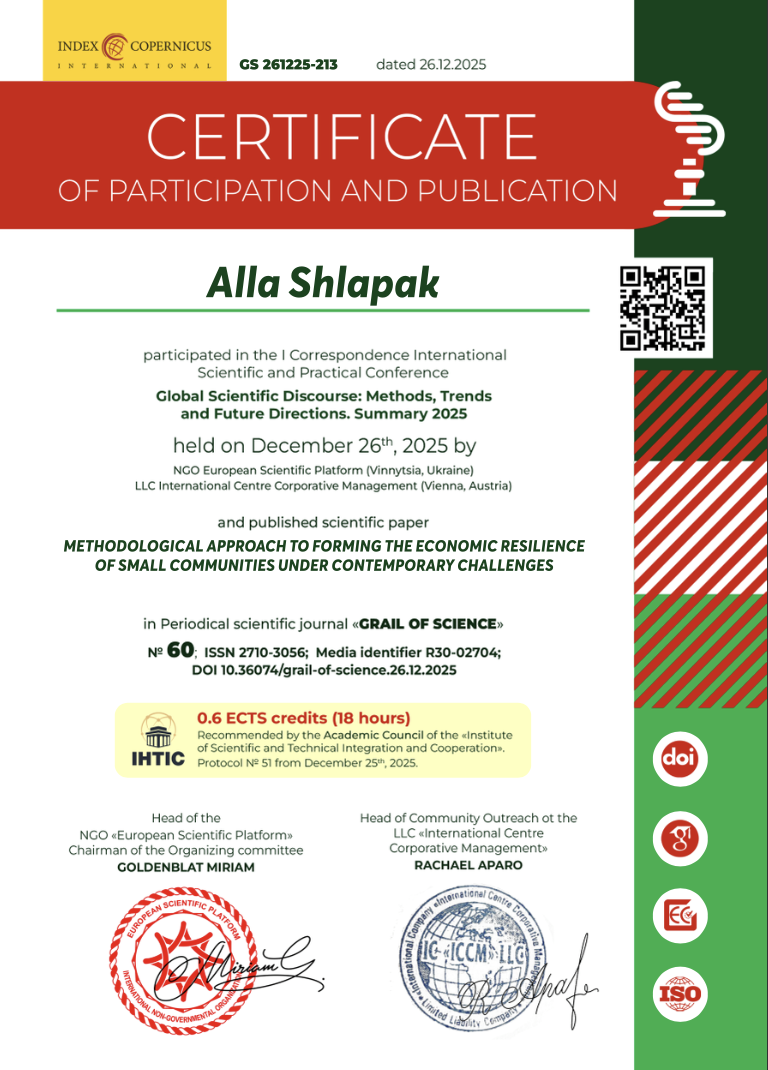 | 12957 | Global Scientific Discourse: Methods, Trends and Future Directions. Summary 2025 | Methodological approach to forming the economic resilience of small communities under contemporary challenges | NGO European Scientific Platform (Vinnytsia, Ukraine) LLC International Centre Corporative Management (Vienna, Austria) |
