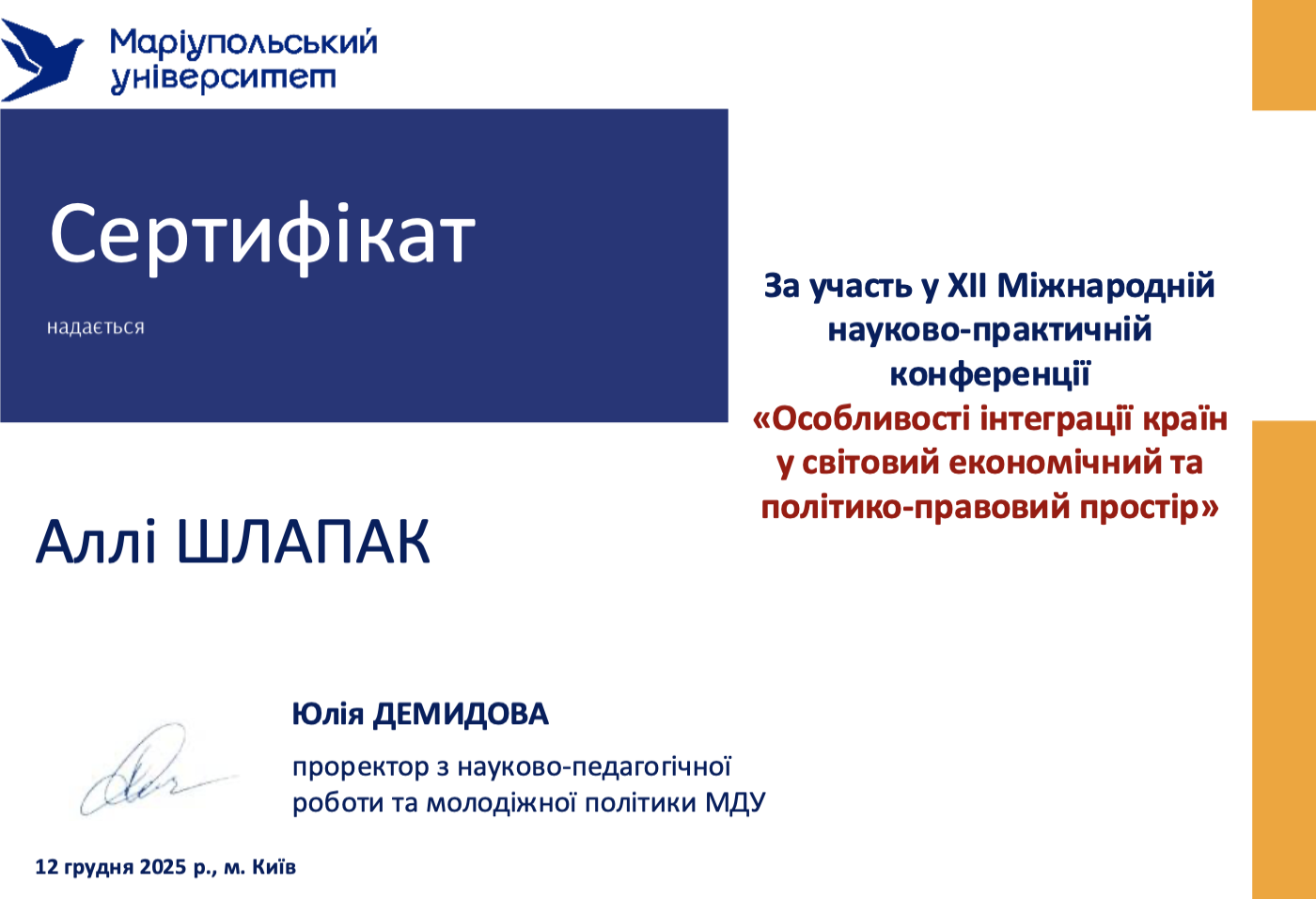 | ID | Назва | Тема доповіді | Місце проведення | Документ, що засвідчує | Дата проведення |