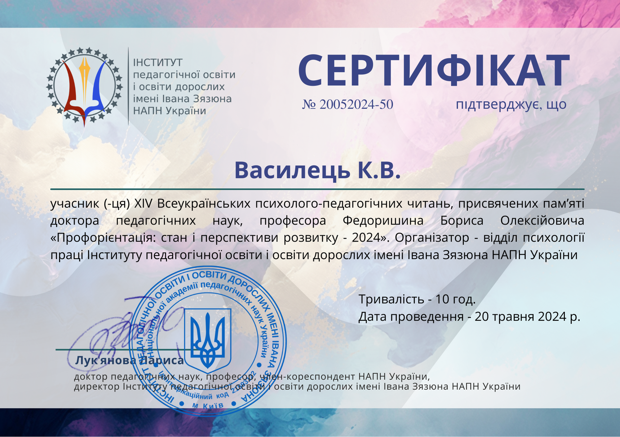 | 10965 | ХІV Всеукраїнські психолого-педагогічні читання, присвячених пам’яті доктора педагогічних наук, Федоришина Бориса Олексійовича ПРОФОРІЄНТАЦІЯ: СТАН І ПЕРСПЕКТИВИ РОЗВИТКУ | Розвиток внутрішніх якостей особистості психолога в мінливих умовах суспільного буття. | онлайн |