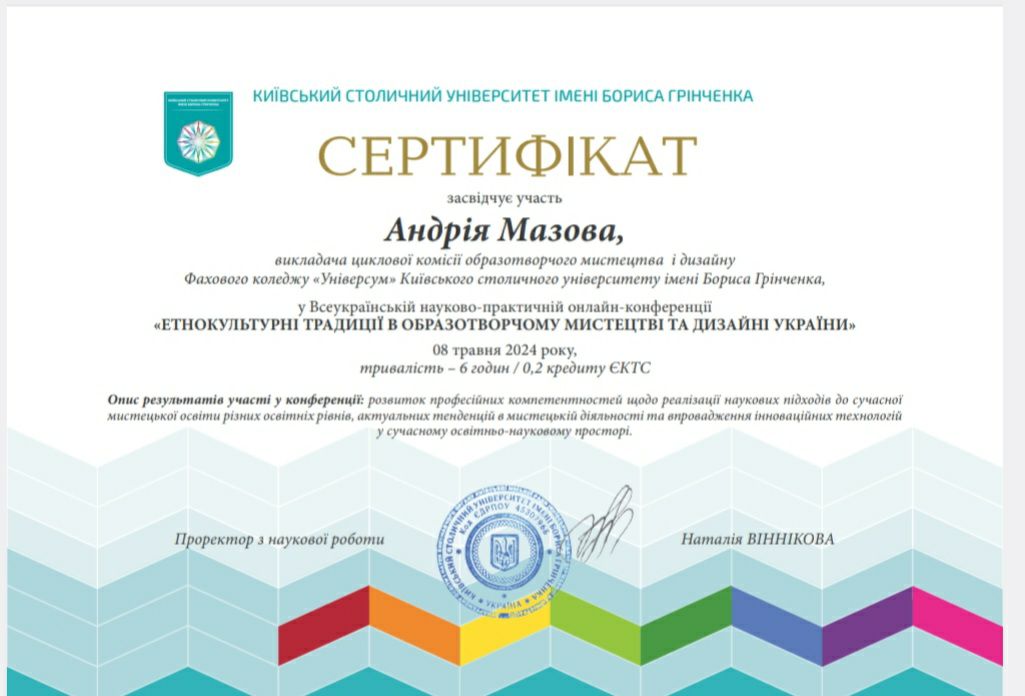 | 11082 | Етнокультурні традиції в образотворчому мистецтві та дизайні України | ЕТНОМОТИВИ У СТРІТ-АРТІ УКРАЇНИ: ДІАЛОГ МІЖ ТРАДИЦІЄЮ І СУЧАСНІСТЮ | Україна, Київ. Київський столичний університет імені Бориса Грінченка |