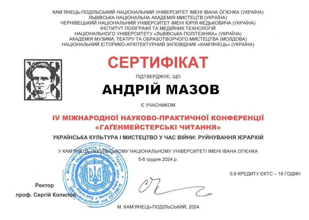 | 11350 | ІV Міжнародна науково-практична конференція ГАГЕНМЕЙСТЕРСЬКІ ЧИТАННЯ | Графіті як засіб арт-терапії | Україна. Кам`янець-Подільський національний університет Івана Огієнка |