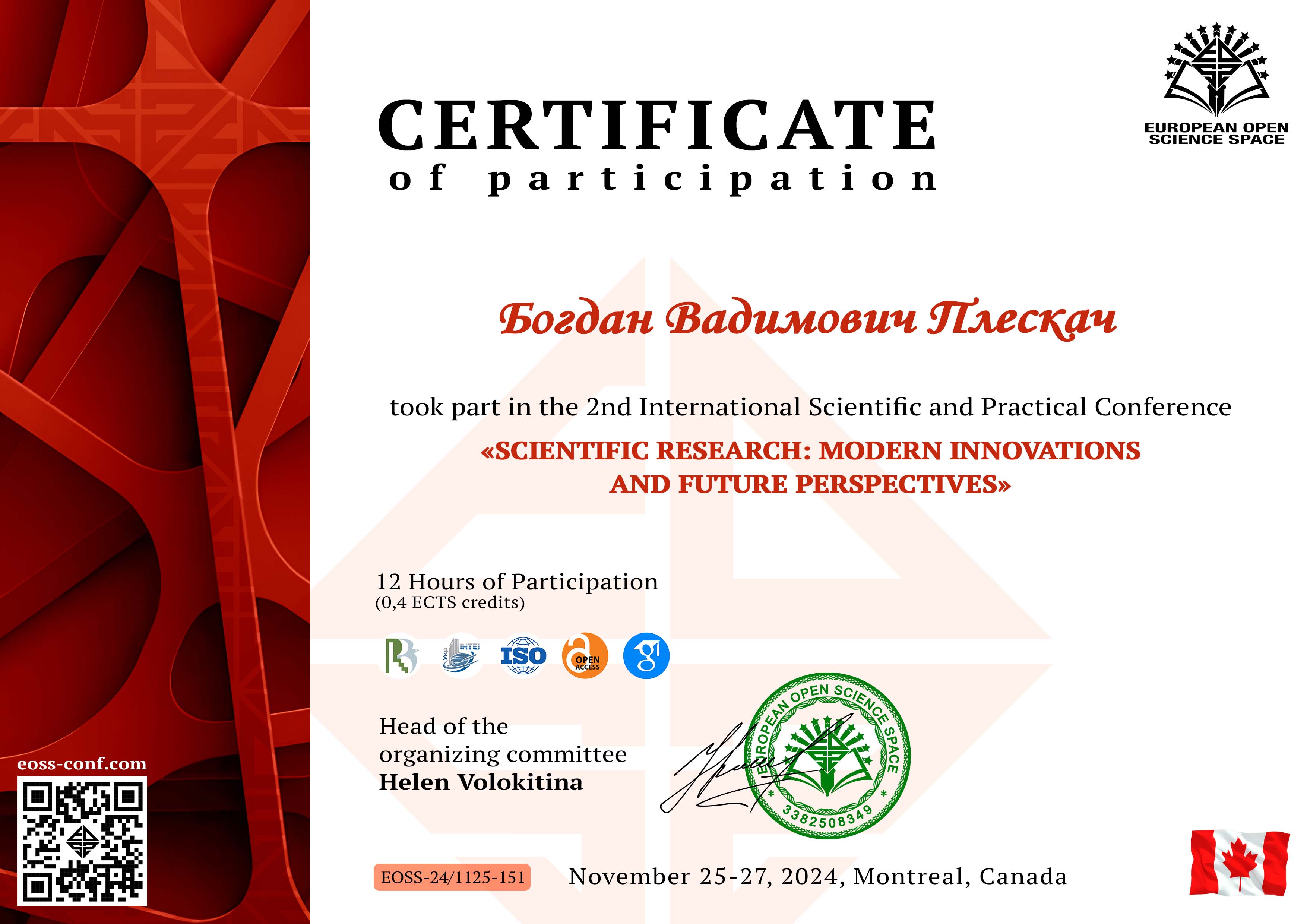 | 11253 | 2 International Scientific and Practical Conference «Scientific Research: Modern Innovations and Future Perspectives» | Особистісне вдосконалення як необхідна умова професійного зростання майбутніх фахівців – психологів | Монреаль, Канада |