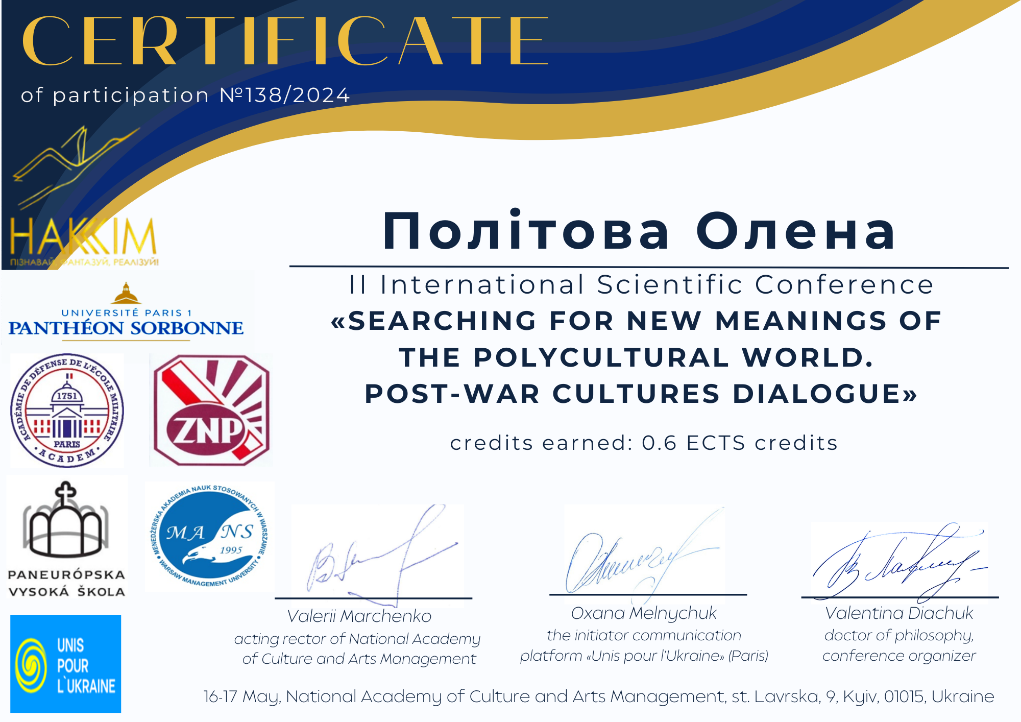 | ID | Назва | Тема доповіді | Місце проведення | Документ, що засвідчує | Дата проведення |
