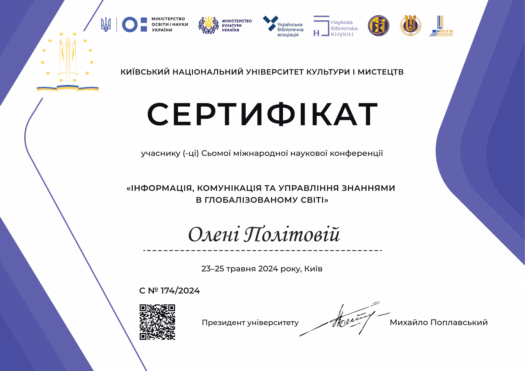 | 11 | Факультет української філології, культури і мистецтва | Кафедра інформаційних комунікацій | 2024 | Всеукраїнський конкурс творчих робіт учнівської та студентської молоді «СОФІТ» | 23.12.2024 00:00 |