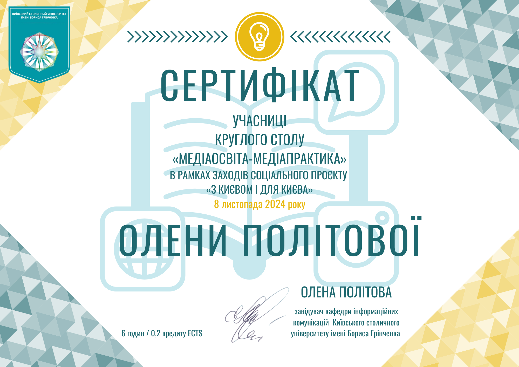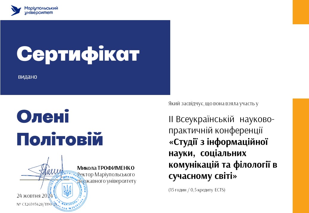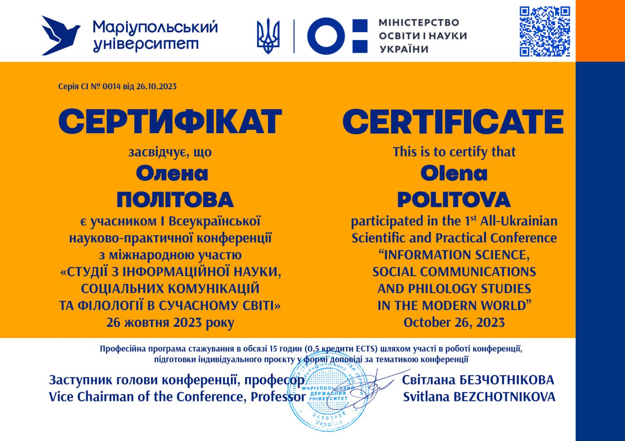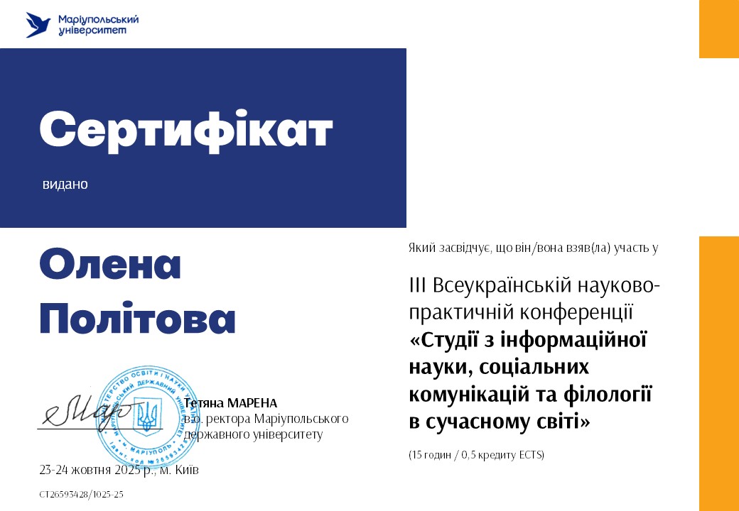 | 873 | Факультет української філології, культури і мистецтва | Кафедра інформаційних комунікацій | 15.4 | 2 | 2025 | https://www.researchgate.net/profile/Olena-Politova |