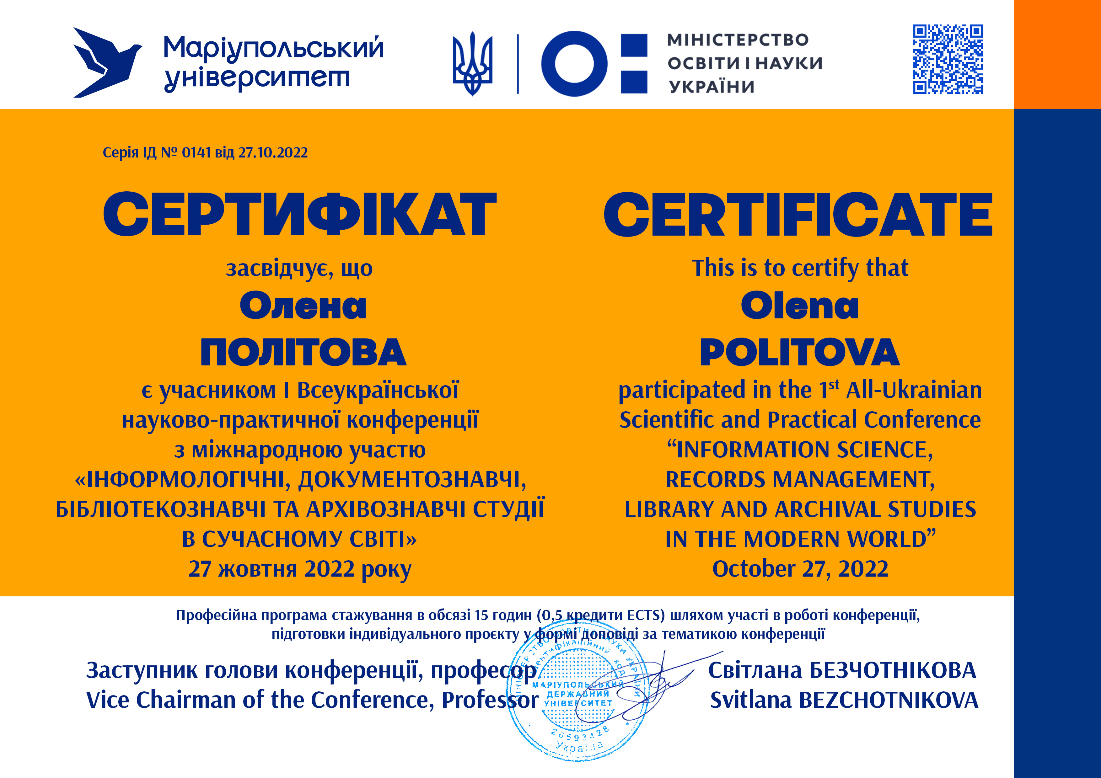 | 10868 | Студії з інформаційної науки, соціальних комунікацій та філології в сучасному світі | Сучасні виклики і нові підходи в реалізації освітньо-професійної програми «Інформаційна, бібліотечна та архівна справа» | Київ |