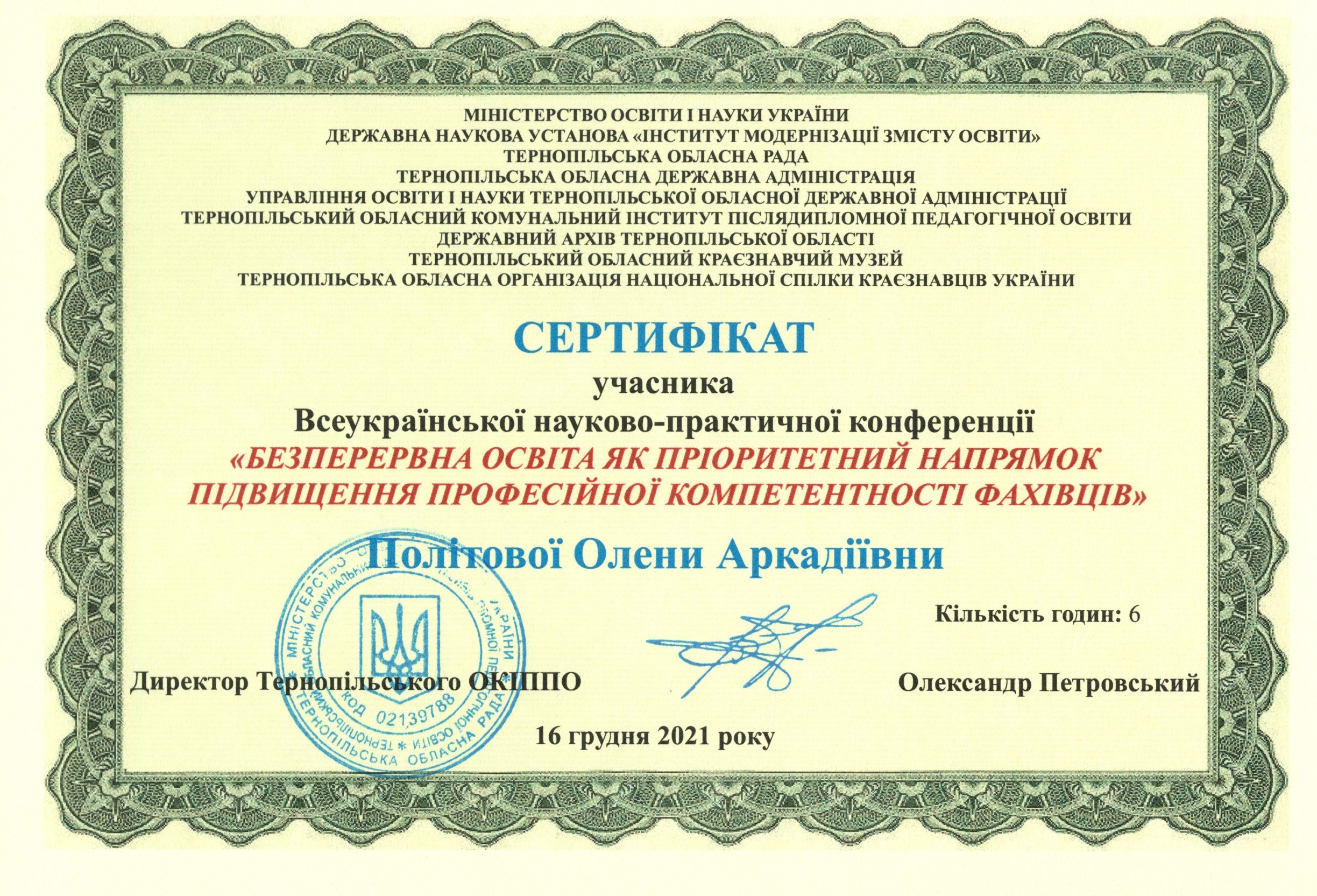 | 8795 | Безперервна освіта як пріоритетний напрямок підвищення професійної компетентності фахівців | Підготовка незалежних фахівців для акредитаційної експертизи освітньо-професійної програми фахової передвищої освіти: з сучасного досвіду | Тернопіль |
