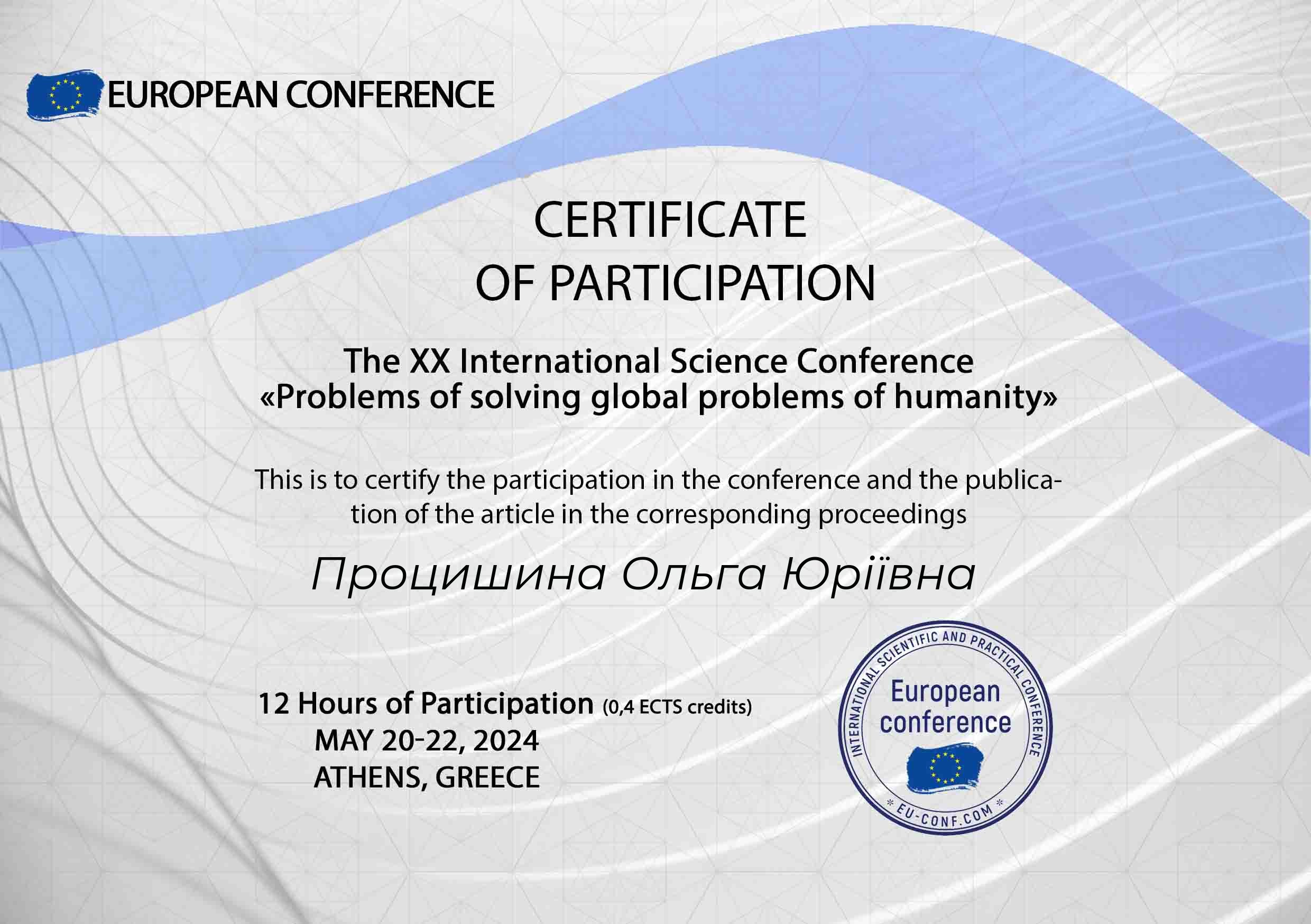 ID Назва Тема доповіді Місце проведення Документ, що засвідчує Дата проведення