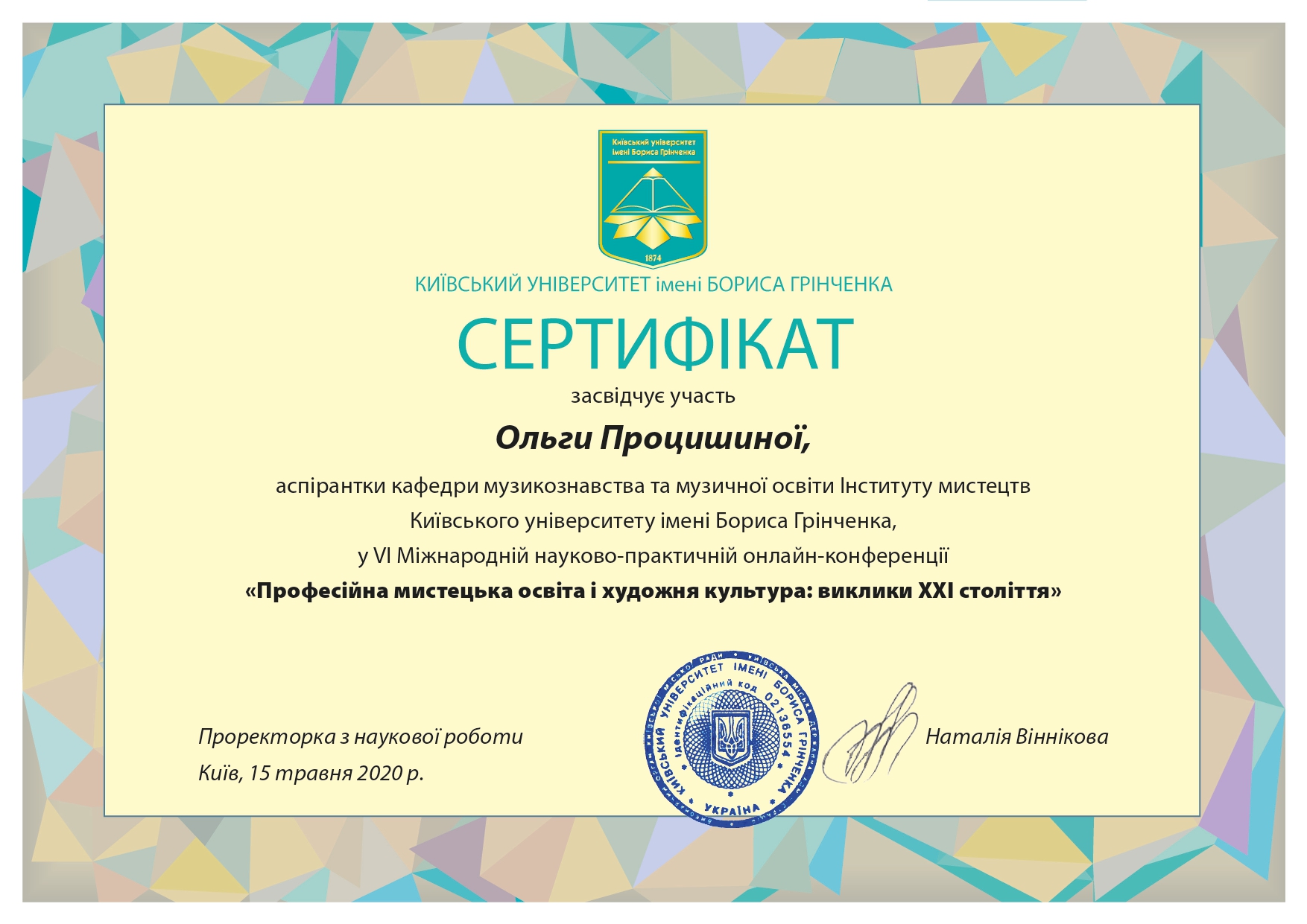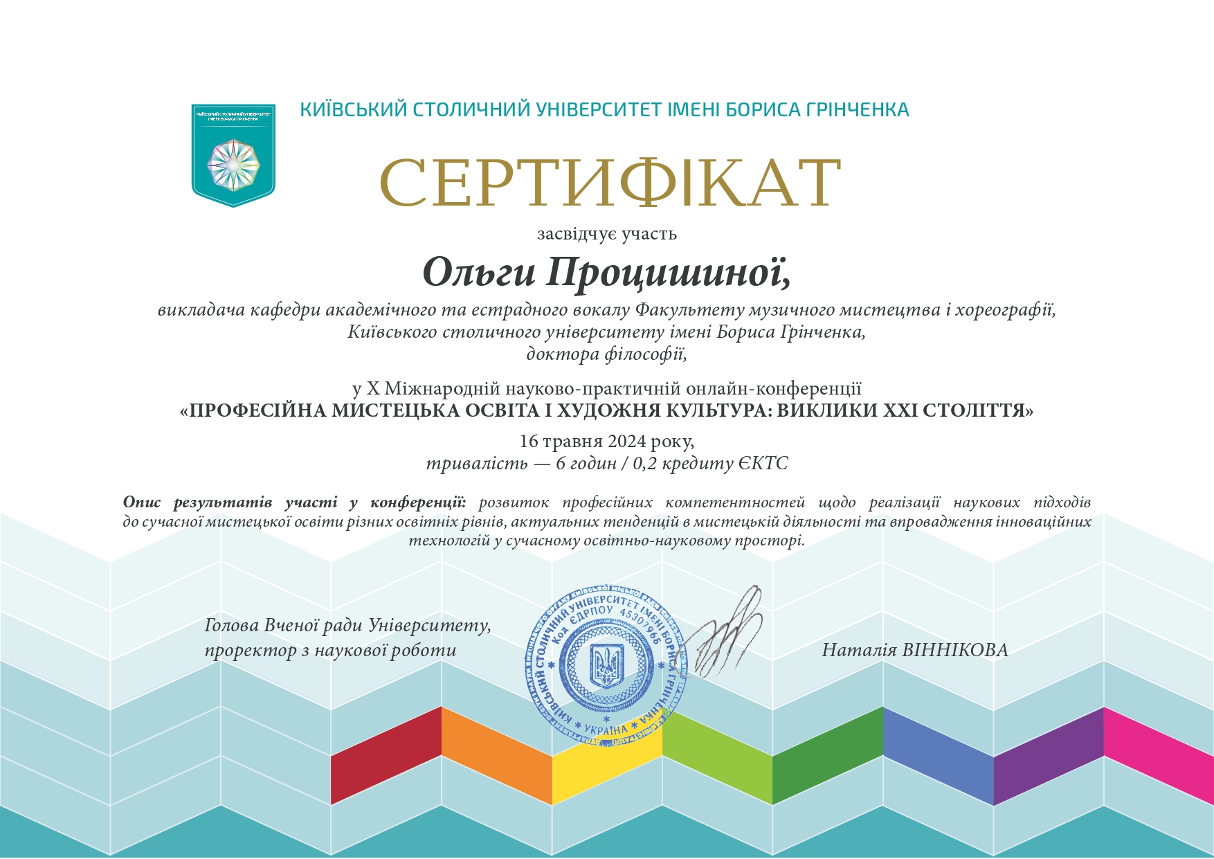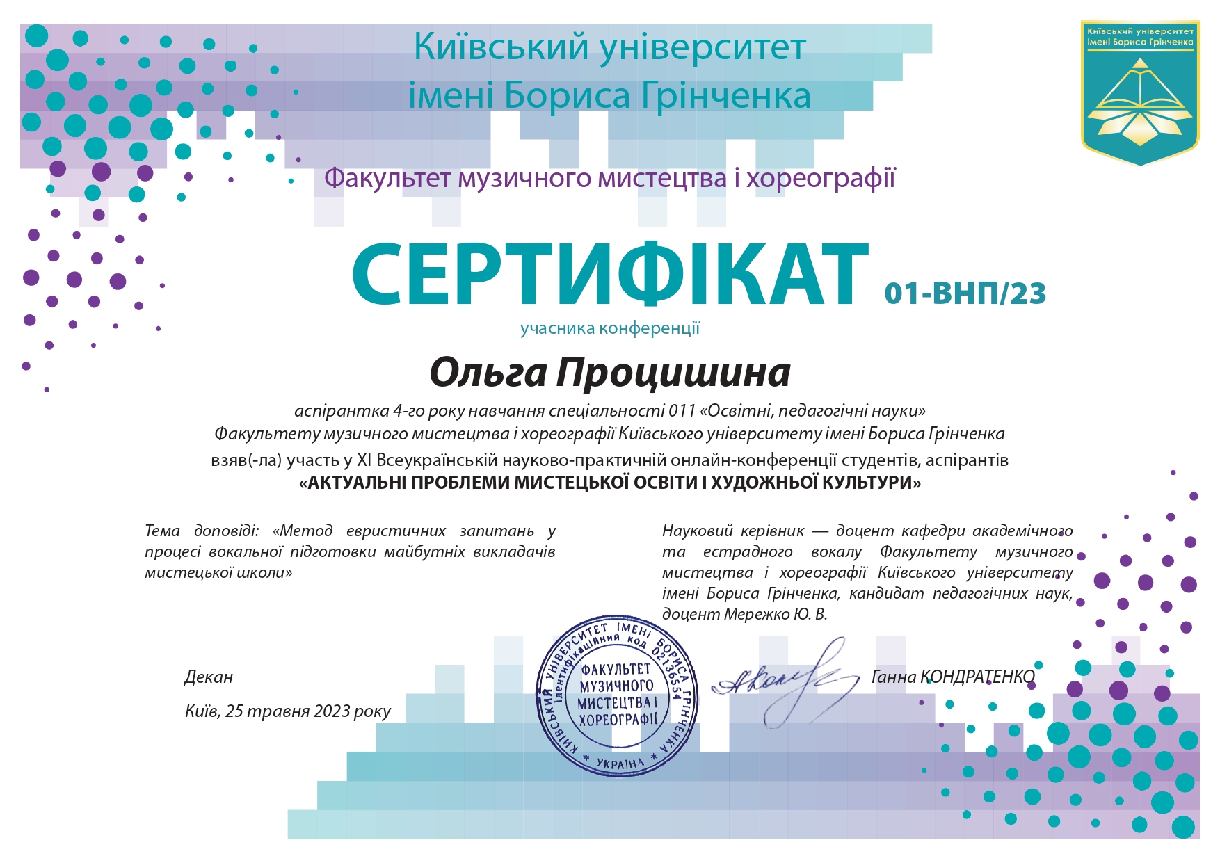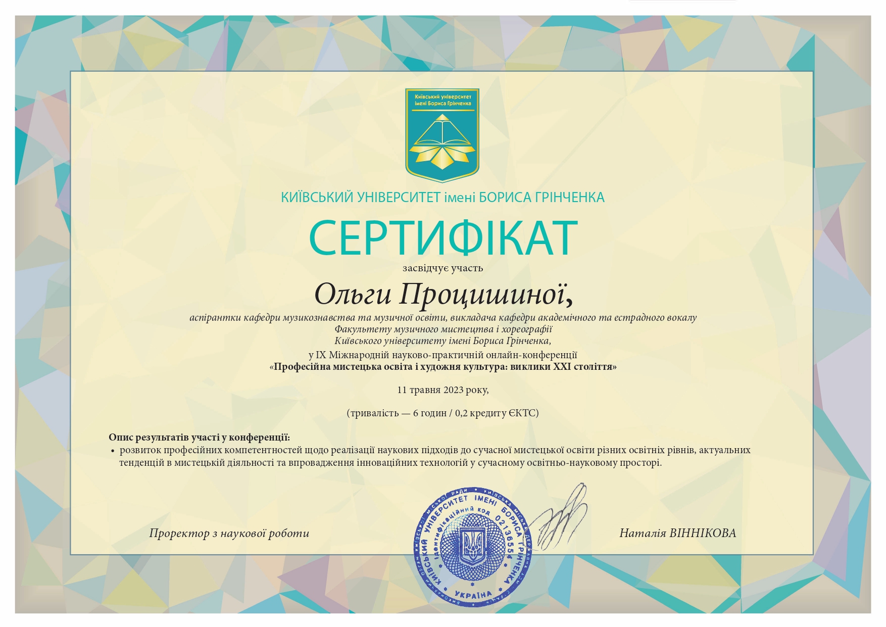 112 Мережко Юлія Валеріївна, доцент кафедри академічного та естрадного вокалу Київського столичного університету імені Бориса Грінченка, кандидат педагогічних наук, доцент. «Формування методичної компетентності майбутніх викладачів мистецької школи на заняттях сольного співу» / спеціальність 011 Освітні, педагогічні науки З вересня 2019 р. і до вересня 2023 р. навчалась в аспірантурі Університету Грінченка на освітньо-науковій програмі «Освітні, педагогічні науки» (спеціальність 011 Освітні, педагогічні науки, галузь знань 01 Освіта/Педагогіка). Київський столичний університет імені Бориса Грінченка Диплом_Процишина.PDF 2024