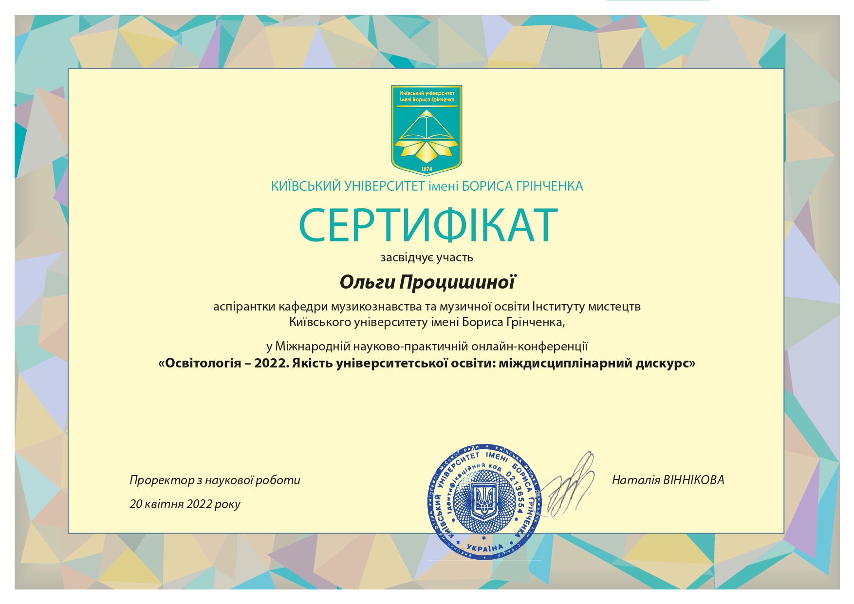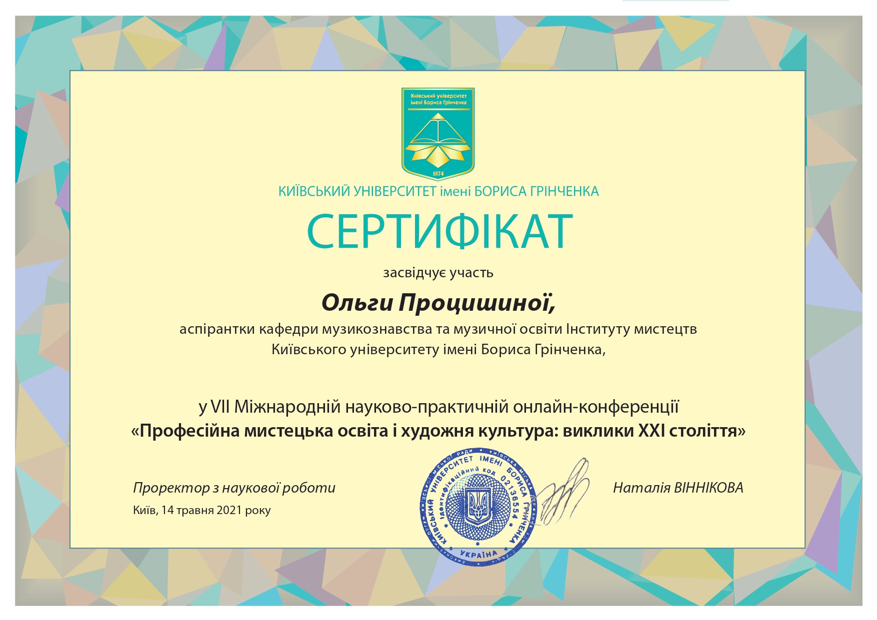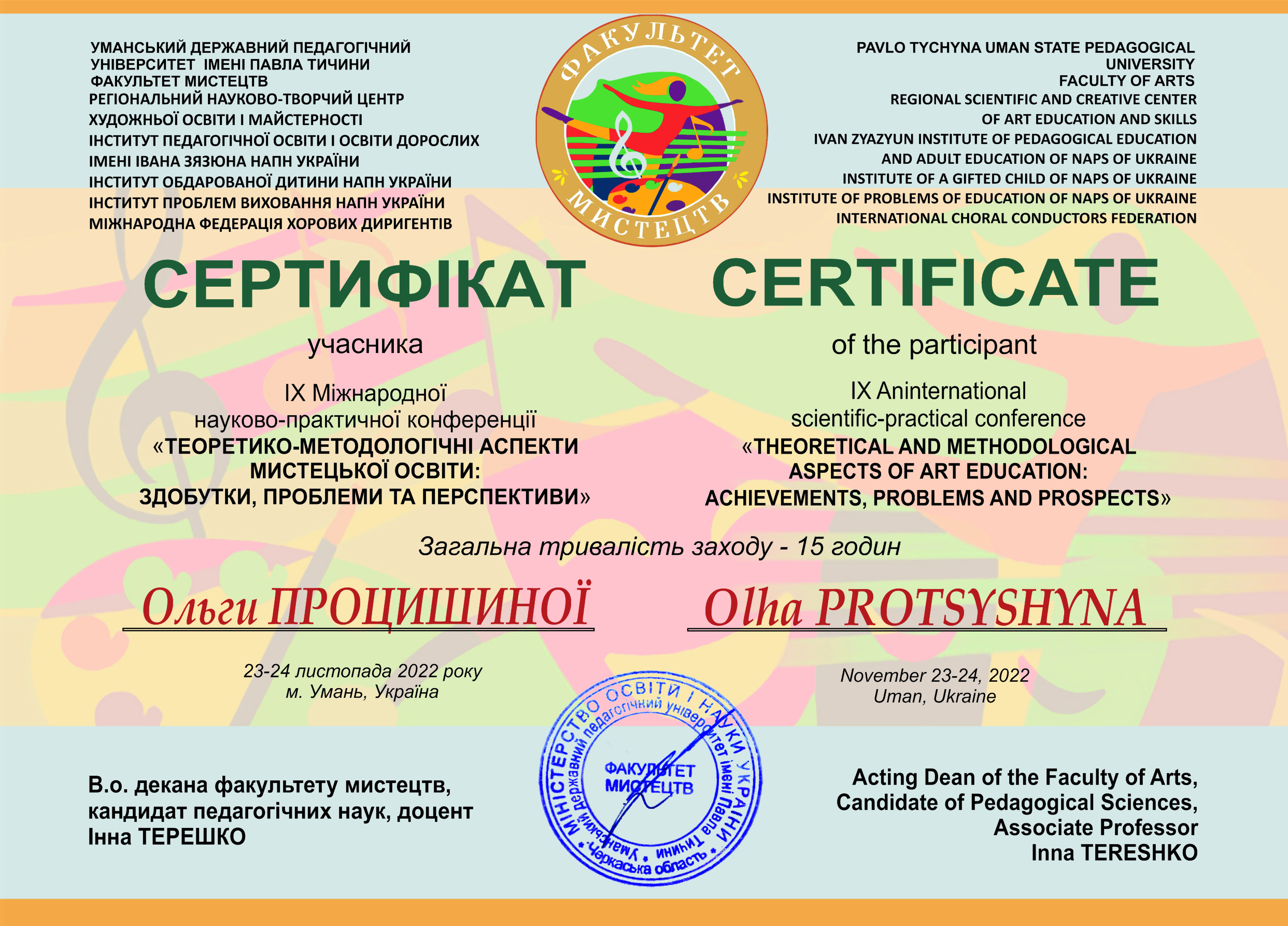 112 Мережко Юлія Валеріївна, доцент кафедри академічного та естрадного вокалу Київського столичного університету імені Бориса Грінченка, кандидат педагогічних наук, доцент. «Формування методичної компетентності майбутніх викладачів мистецької школи на заняттях сольного співу» / спеціальність 011 Освітні, педагогічні науки З вересня 2019 р. і до вересня 2023 р. навчалась в аспірантурі Університету Грінченка на освітньо-науковій програмі «Освітні, педагогічні науки» (спеціальність 011 Освітні, педагогічні науки, галузь знань 01 Освіта/Педагогіка). Київський столичний університет імені Бориса Грінченка Диплом_Процишина.PDF 2024